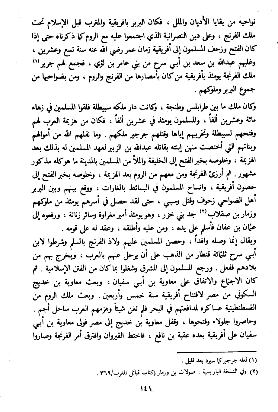 نواحيه من بقايا الأديان والملل، فكان البربر بإفريقية والمغرب قبل الإسلام تحت ملك الفرنج، وعلى دين النصرانية الّذي اجتمعوا عليه مع الروم كما ذكرناه حتى إذا كان الفتح وزحف المسلمون إلى إفريقية زمان عمر رضي الله عنه سنة تسع وعشرين، وغلبهم عبد الله بن سعد بن أبي سرح من بني عامر بن لؤيّ، فجمع لهم جرير [1] ملك الفرنجة يومئذ بإفريقية من كان بأمصارها من الفرنج والروم، ومن بضواحيها من جموع البربر وملوكهم.