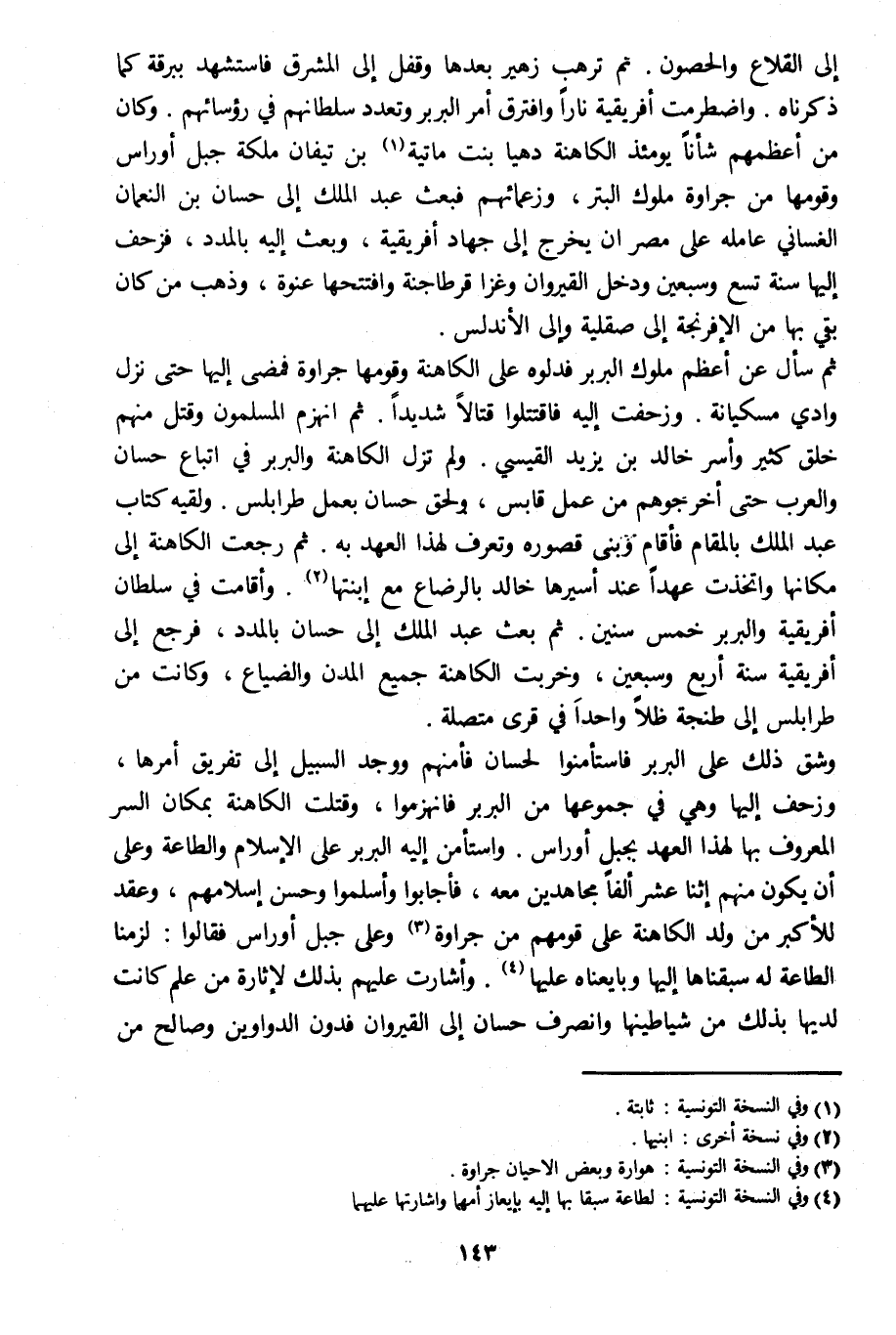 ثم سأل عن أعظم ملوك البربر فدلوه على الكاهنة وقومها جراوة فمضى إليها حتى نزل وادي مسكيانة. وزحفت إليه فاقتتلوا قتالا شديدا. ثم انهزم المسلمون وقتل منهم خلق كثير وأسر خالد بن يزيد القيسي. ولم تزل الكاهنة والبربر في اتباع حسان والعرب حتى أخرجوهم من عمل قابس، ولحق حسان بعمل طرابلس. ولقيه كتاب عبد الملك بالمقام فأقام وبنى قصوره وتعرف لهذا العهد به. ثم رجعت الكاهنة إلى مكانها واتخذت عهدا عند أسيرها خالد بالرضاع مع ابنتها [2] . وأقامت في سلطان إفريقية والبربر خمس سنين. ثم بعث عبد الملك إلى حسان بالمدد، فرجع إلى إفريقية سنة أربع وسبعين، وخربت الكاهنة جميع المدن والضياع، وكانت من طرابلس إلى طنجة ظلا واحدا في قرى متصلة.
