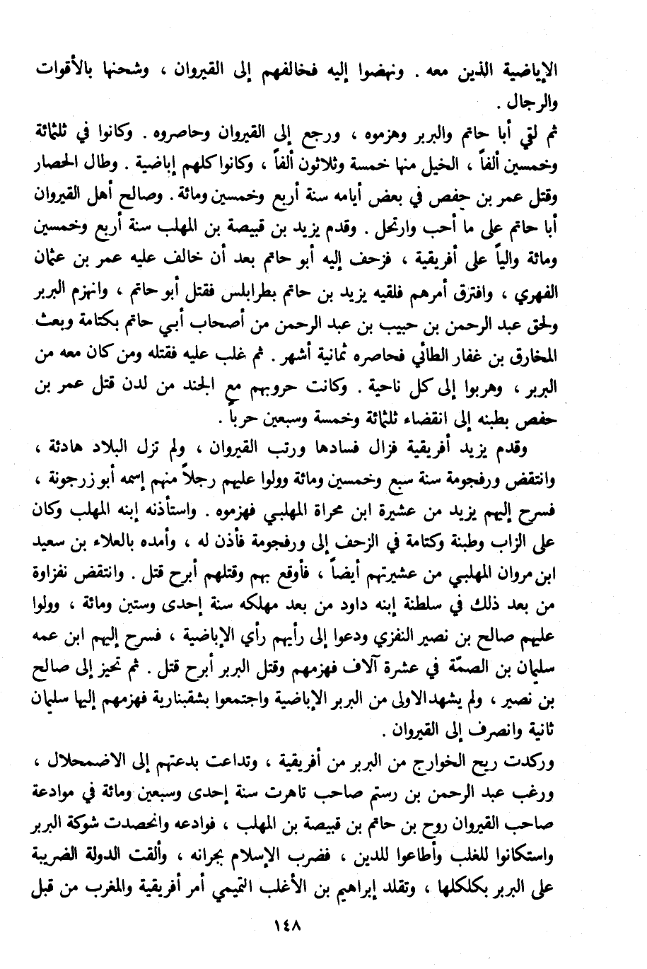 ثم لقي أبا حاتم والبربر وهزموه، ورجع إلى القيروان وحاصروه. وكانوا في ثلاثمائة وخمسين ألفا، الخيل منها خمسة وثلاثون ألفا، وكانوا كلهم إباضية. وطال الحصار وقتل عمر بن حفص في بعض أيامه سنة أربع وخمسين ومائة. وصالح أهل القيروان أبا حاتم على ما أحب وارتحل. وقدم يزيد بن قبيصة بن المهلب سنة أربع وخمسين ومائة واليا على إفريقية، فزحف إليه أبو حاتم بعد أن خالف عليه عمر بن عثمان الفهري، وافترق أمرهم فلقيه يزيد بن حاتم بطرابلس فقتل أبو حاتم، وانهزم البربر ولحق عبد الرحمن بن حبيب بن عبد الرحمن من أصحاب أبي حاتم بكتامة وبعث المخارق بن غفار الطائي فحاصره ثمانية أشهر. ثم غلب عليه فقتله ومن كان معه من البربر، وهربوا إلى كل ناحية. وكانت حروبهم مع الجند من لدن قتل عمر بن حفص بطبنة إلى انقضاء ثلاثمائة وخمسة وسبعين حربا.