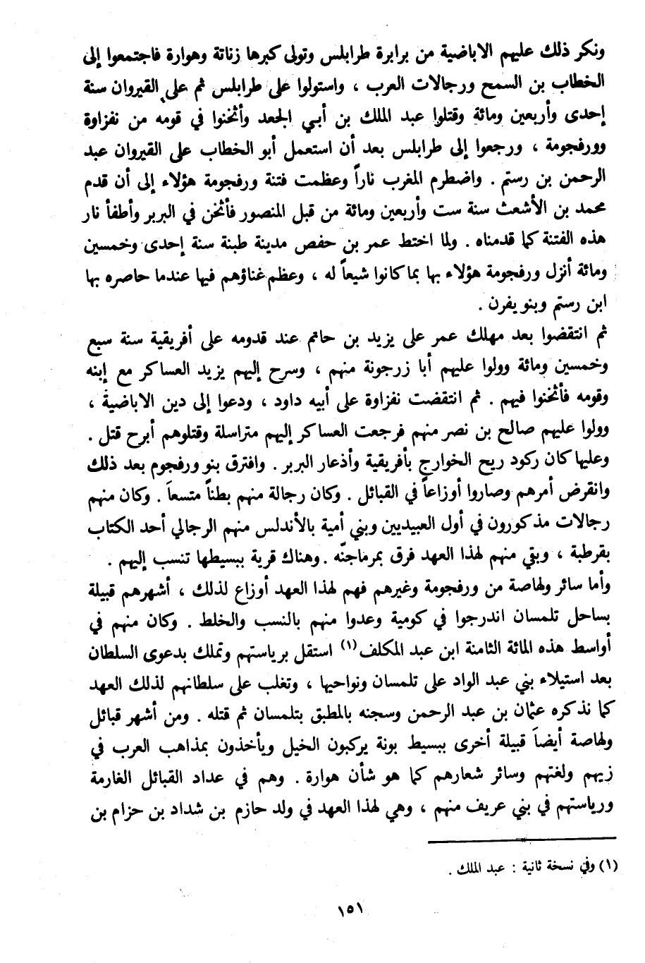 ونكر ذلك عليهم الاباضية من برابرة طرابلس وتولى كبرها زناتة وهوارة فاجتمعوا إلى الخطاب بن السمح ورجالات العرب، واستولوا على طرابلس ثم على القيروان سنة إحدى وأربعين ومائة وقتلوا عبد الملك بن أبي الجعد وأثخنوا في قومه من نفزاوة وورفجومة، ورجعوا إلى طرابلس بعد أن استعمل أبو الخطاب على القيروان عبد الرحمن بن رستم. واضطرم المغرب نارا وعظمت فتنة ورفجومة هؤلاء إلى أن قدم محمد بن الأشعث سنة ست وأربعين ومائة من قبل المنصور فأثخن في البربر وأطفأ نار هذه الفتنة كما قدمناه. ولما اختط عمر بن حفص مدينة طبنة سنة إحدى وخمسين ومائة أنزل ورفجومة هؤلاء بها بما كانوا شيعا له، وعظم غناؤهم فيها عند ما حاصره بها ابن رستم وبنو يفرن.