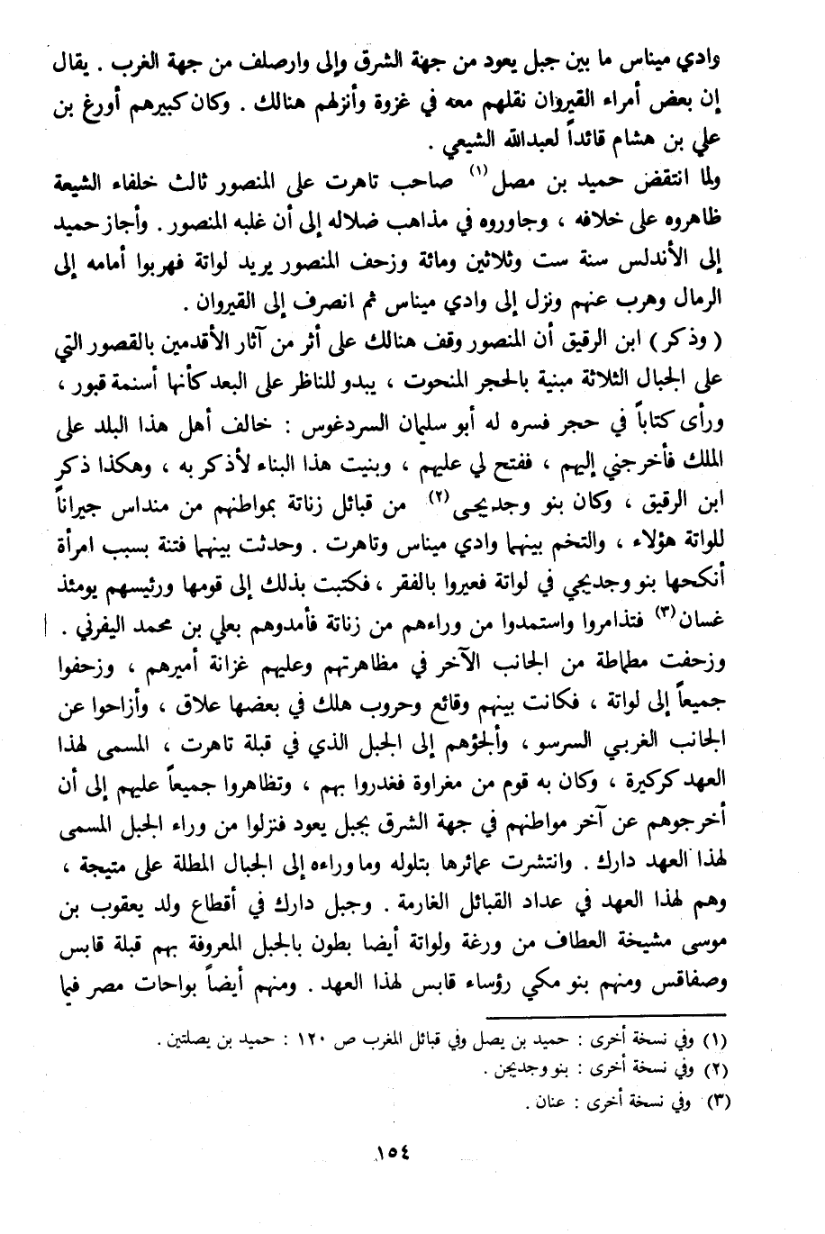 (وذكر) ابن الرقيق أن المنصور وقف هنالك على أثر من آثار الأقدمين بالقصور التي على الجبال الثلاثة مبنية بالحجر المنحوت، يبدو للناظر على البعد كأنها أسنمة قبور، ورأى كتابا في حجر فسره له أبو سليمان السردغوس: خالف أهل هذا البلد على الملك فأخرجني إليهم، ففتح لي عليهم، وبنيت هذا البناء لأذكر به، وهكذا ذكر ابن الرقيق، وكان بنو وجديجى [2] من قبائل زناتة بمواطنهم من منداس جيرانا للواتة هؤلاء، والتخم بينهما وادي ميناس وتاهرت. وحدثت بينهما فتنة بسبب امرأة أنكحها بنو وجديجي في لواتة فعيروا بالفقر، فكتبت بذلك إلى قومها ورئيسهم يومئذ غسان [3] فتذامروا واستمدوا من وراءهم من زناتة فأمدوهم بعلي بن محمد اليفرني.