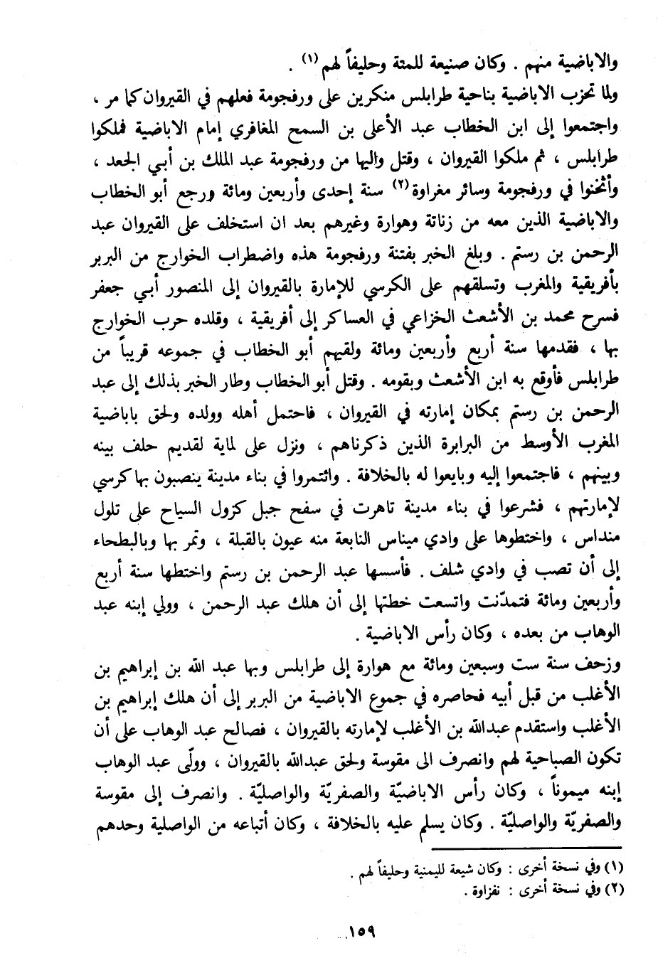 ولما تحزب الاباضية بناحية طرابلس منكرين على ورفجومة فعلهم في القيروان كما مر، واجتمعوا إلى ابن الخطاب عبد الأعلى بن السمح المغافري إمام الاباضية فملكوا طرابلس، ثم ملكوا القيروان، وقتل واليها من ورفجومة عبد الملك بن أبي الجعد، وأثخنوا في ورفجومة وسائر مغراوة [2] سنة إحدى وأربعين ومائة ورجع أبو الخطاب والاباضية الذين معه من زناتة وهوارة وغيرهم بعد ان استخلف على القيروان عبد الرحمن بن رستم. وبلغ الخبر بفتنة ورفجومة هذه واضطراب الخوارج من البربر بإفريقية والمغرب وتسلقهم على الكرسي للإمارة بالقيروان إلى المنصور أبي جعفر فسرح محمد بن الأشعث الخزاعي في العساكر إلى إفريقية، وقلده حرب الخوارج بها، فقدمها سنة أربع وأربعين ومائة ولقيهم أبو الخطاب في جموعه قريبا من طرابلس فأوقع به ابن الأشعث وبقومه. وقتل أبو الخطاب وطار الخبر بذلك إلى عبد الرحمن بن رستم بمكان إمارته في القيروان، فاحتمل أهله وولده ولحق باباضية المغرب الأوسط من البرابرة الذين ذكرناهم، ونزل على لماية لقديم حلف بينه وبينهم، فاجتمعوا إليه وبايعوا له بالخلافة. وائتمروا في بناء مدينة ينصبون بها كرسي لإمارتهم، فشرعوا في بناء مدينة تاهرت في سفح جبل كزول السياح على تلول منداس، واختطوها على وادي ميناس النابعة منه عيون بالقبلة، وتمر بها وبالبطحاء إلى أن تصب في وادي شلف. فأسسها عبد الرحمن بن رستم واختطها سنة أربع وأربعين ومائة فتمدّنت واتسعت خطتها إلى أن هلك عبد الرحمن، وولي ابنه عبد الوهاب من بعده، وكان رأس الاباضية.