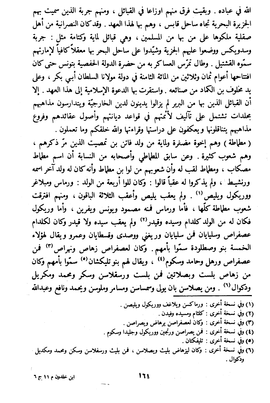 الله في عباده. وبقيت فرق منهم أوزاعا في القبائل، ومنهم جربة الذين سميت بهم الجزيرة البحرية تجاه ساحل قابس، وهم بها لهذا العهد. وقد كان النصرانية من أهل صقلّيّة ملكوها على من بها من المسلمين، وهي قبائل لماية وكتامة مثل: جربة وسدويكش ووضعوا عليهم الجزية وشيّدوا على ساحل البحر بها معقلا كافيا لإمارتهم سمّوه القشتيل. وطال تمرّس العساكر به من حضرة الدولة الحفصية بتونس حتى كان افتتاحها أعوام ثمان وثلاثين من المائة الثامنة في دولة مولانا السلطان أبي بكر، وعلى يد مخلوف بن الكماد من صنائعه. واستقرت بها الدعوة الإسلامية إلى هذا العهد. إلا أن القبائل الذين بها من البربر لم يزالوا يدينون لدين الخارجيّة ويتدارسون مذاهبهم مجلدات تشتمل على تآليف لأئمتهم في قواعد ديانتهم وأصول عقائدهم وفروع مذاهبهم يتناقلونها ويعكفون على دراستها وقراءتها والله خلقكم وما تعملون.