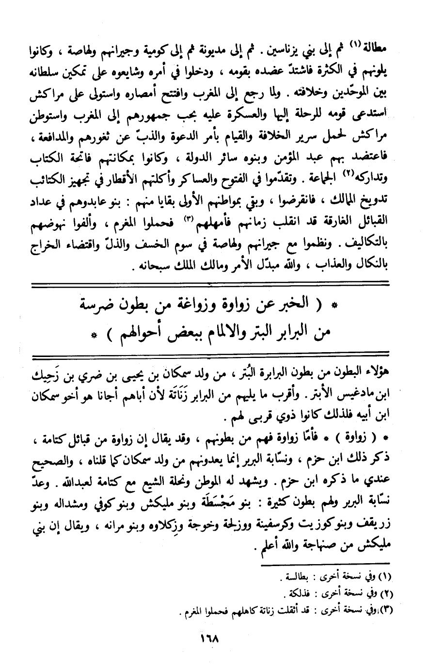 (زواوة) فأمّا زواوة فهم من بطونهم، وقد يقال إن زواوة من قبائل كتامة، ذكر ذلك ابن حزم، ونسّابة البربر إنما يعدونهم من ولد سمكان كما قلناه، والصحيح عندي ما ذكره ابن حزم. ويشهد له الموطن ونحلة الشيع مع كتامة لعبد الله. وعدّ نسّابة البربر ولهم بطون كثيرة: بنو مجسطة وبنو مليكش وبنو كوفي ومشداله وبنو زريقف وبنو كوزيت وكرسفينة ووزلجة وخوجة وزكلاوة وبنو مرانه، ويقال إن بني مليكش من صنهاجة والله أعلم.