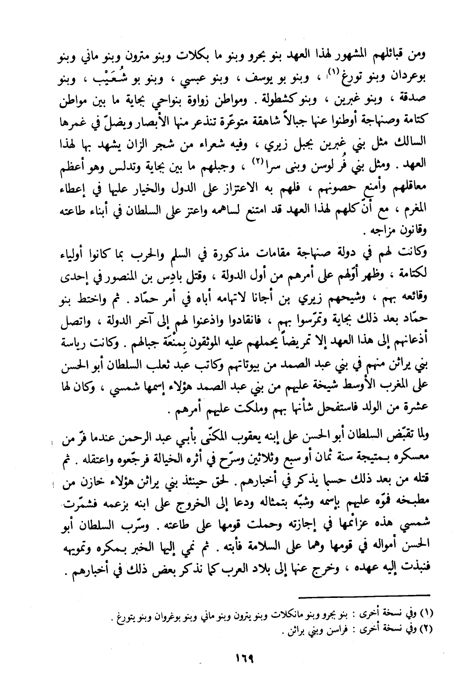 ومن قبائلهم المشهور لهذا العهد بنو بجرو وبنو مابكلات وبنو مترون وبنو ماني وبنو بوعردان وبنو تورغ [1] ، وبنو بو يوسف، وبنو عبسي، وبنو بو شعيب، وبنو صدقة، وبنو غبرين، وبنو كشطولة. ومواطن زواوة بنواحي بجاية ما بين مواطن كتامة وصنهاجة أوطنوا عنها جبالا شاهقة متوعّرة تنذعر منها الأبصار ويضلّ في غمرها السالك مثل بني غبرين بجبل زيري، وفيه شعراء من شجر الزان يشهد بها لهذا العهد. ومثل بني فرلوسن وبني سرا [2] ، وجبلهم ما بين بجاية وتدلس وهو أعظم معاقلهم وأمنع حصونهم، فلهم به الاعتزاز على الدول والخيار عليها في إعطاء المغرم، مع أنّ كلهم لهذا العهد قد امتنع لساهمه واعتز على السلطان في أبناء طاعته وقانون مزاجه.