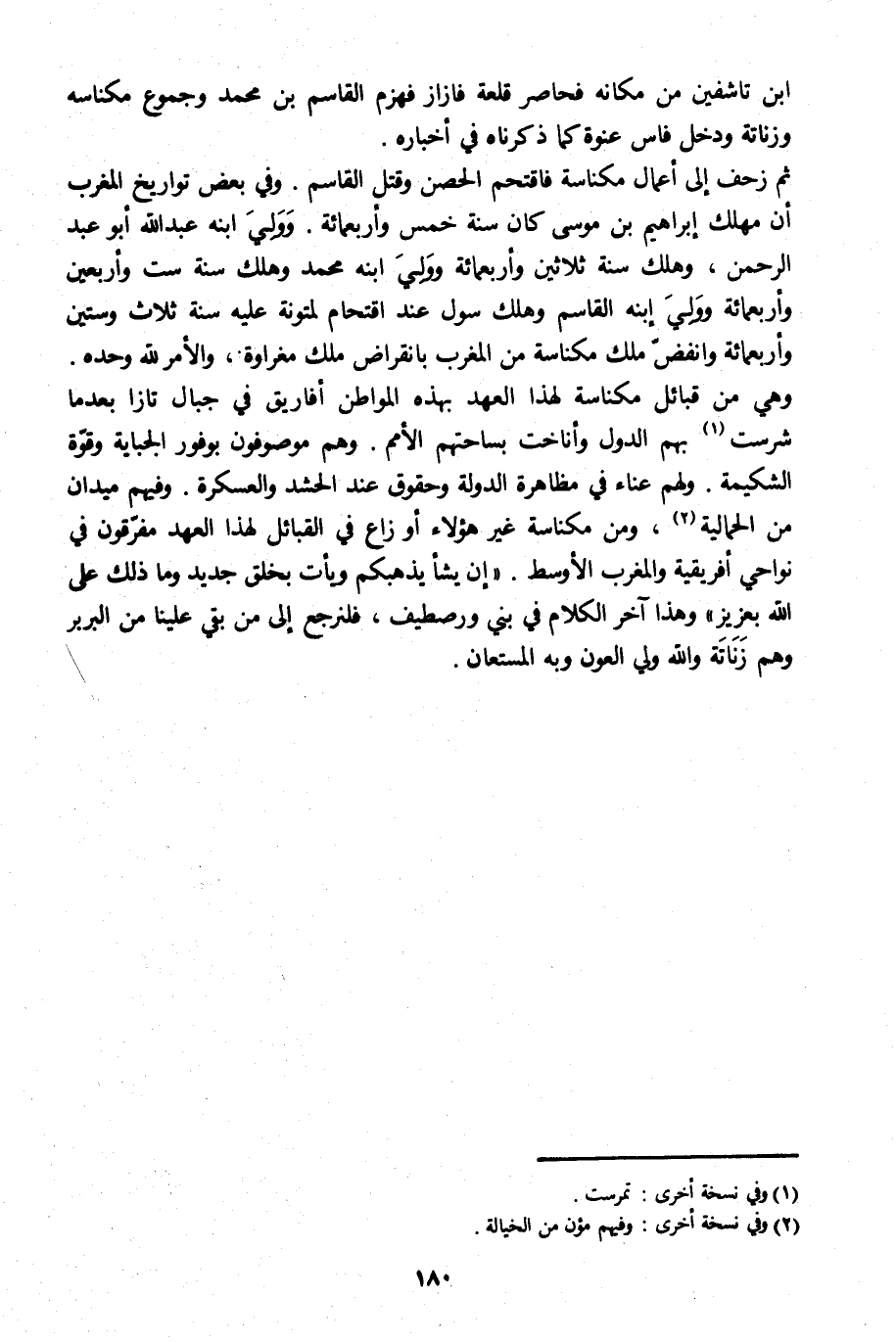 ثم زحف إلى أعمال مكناسة فاقتحم الحصن وقتل القاسم. وفي بعض تواريخ المغرب أن مهلك إبراهيم بن موسى كان سنة خمس وأربعمائة. وولي ابنه عبد الله أبو عبد الرحمن، وهلك سنة ثلاثين وأربعمائة وولي ابنه محمد وهلك سنة ست وأربعين وأربعمائة وولي ابنه القاسم وهلك سول عند اقتحام لمتونة عليه سنة ثلاث وستين وأربعمائة وانفضّ ملك مكناسة من المغرب بانقراض ملك مغراوة، والأمر للَّه وحده.