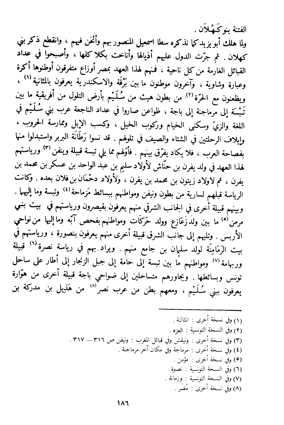 ولما هلك أبو يزيد كما نذكره سطا إسماعيل المنصور بهم وأثخن فيهم، وانقطع ذكر بني كهلان. ثم جرّت الدول عليهم أذيالها وأناخت بكلاكلها، وأصبحوا في عداد القبائل الغارمة من كل ناحية، فمنهم لهذا العهد بمصر أوزاع متفرقون أوطنوها أكرة وعبارة وشاوية، وآخرون موطنون ما بين برقة والاسكندرية يعرفون بالمثانية [1] ، ويظعنون مع الحرّة [2] من بطون هيث من سليم بأرض التلول من إفريقية ما بين تبسة إلى مرماجنة إلى باجة، ظواعن صاروا في عداد الناجعة عرب بني سليم في اللغة والزيّ وسكنى الخيام وركوب الخيل، وكسب الإبل وممارسة الحروب، وإيلاف الرحلتين في الشتاء والصيف في تلولهم. قد نسوا رطانة البربر واستبدلوا منها بفصاحة العرب، فلا يكاد يفرّق بينهم. فأوّلهم مما يلي تبسة قبيلة وينفن [3] ورياستهم لهذا العهد في ولد يفرن بن حنّاش لأولاد سليم بن عبد الواحد بن عسكر بن محمد بن يفرن، ثم لأولاد زيتون بن محمد بن يفرن، ولأولاد دحمان بن فلان بعده. وكانت الرئاسة قبلهم لسارية من بطون ونيفن ومواطنهم ببسائط مزماحة [4] وتبسة وما إليهما.