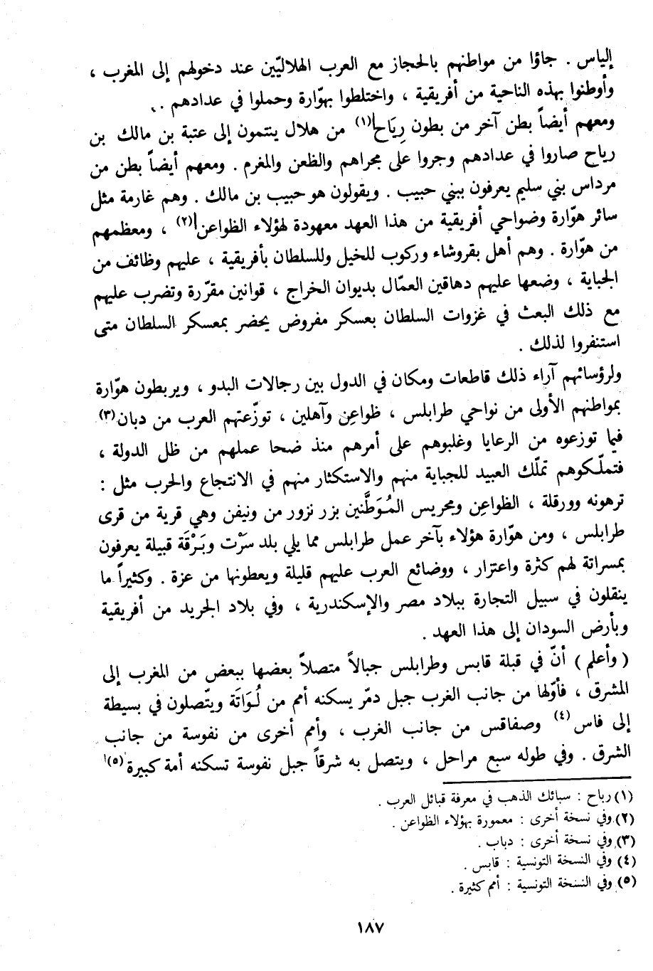 (وأعلم) أنّ في قبلة قابس وطرابلس جبالا متصلا بعضها ببعض من المغرب إلى المشرق، فأوّلها من جانب الغرب جبل دمّر يسكنه أمم من لواتة ويتّصلون في بسيطة إلى فاس [4] وصفاقس من جانب الغرب، وأمم أخرى من نفوسة من جانب الشرق. وفي طوله سبع مراحل، ويتصل به شرقا جبل نفوسة تسكنه أمة كبيرة [5]