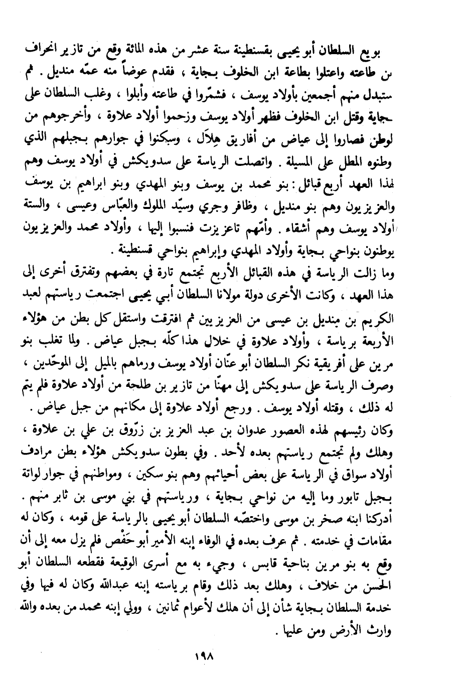 وما زالت الرئاسة في هذه القبائل الأربع تجتمع تارة في بعضهم وتفترق أخرى إلى هذا العهد، وكانت الأخرى دولة مولانا السلطان أبي يحيى اجتمعت رياستهم لعبد الكريم بن منديل بن عيسى من العزيزيين ثم افترقت واستقل كل بطن من هؤلاء الأربعة برياسة، وأولاد علاوة في خلال هذا كلّه بجبل عياض. ولما تغلب بنو مرين على إفريقية نكر السلطان أبو عنّان أولاد يوسف ورماهم بالميل إلى الموحّدين، وصرف الرئاسة على سدويكش إلى مهنّا من تازير بن طلحة من أولاد علاوة فلم يتم له ذلك، وقتله أولاد يوسف. ورجع أولاد علاوة إلى مكانهم من جبل عياض.