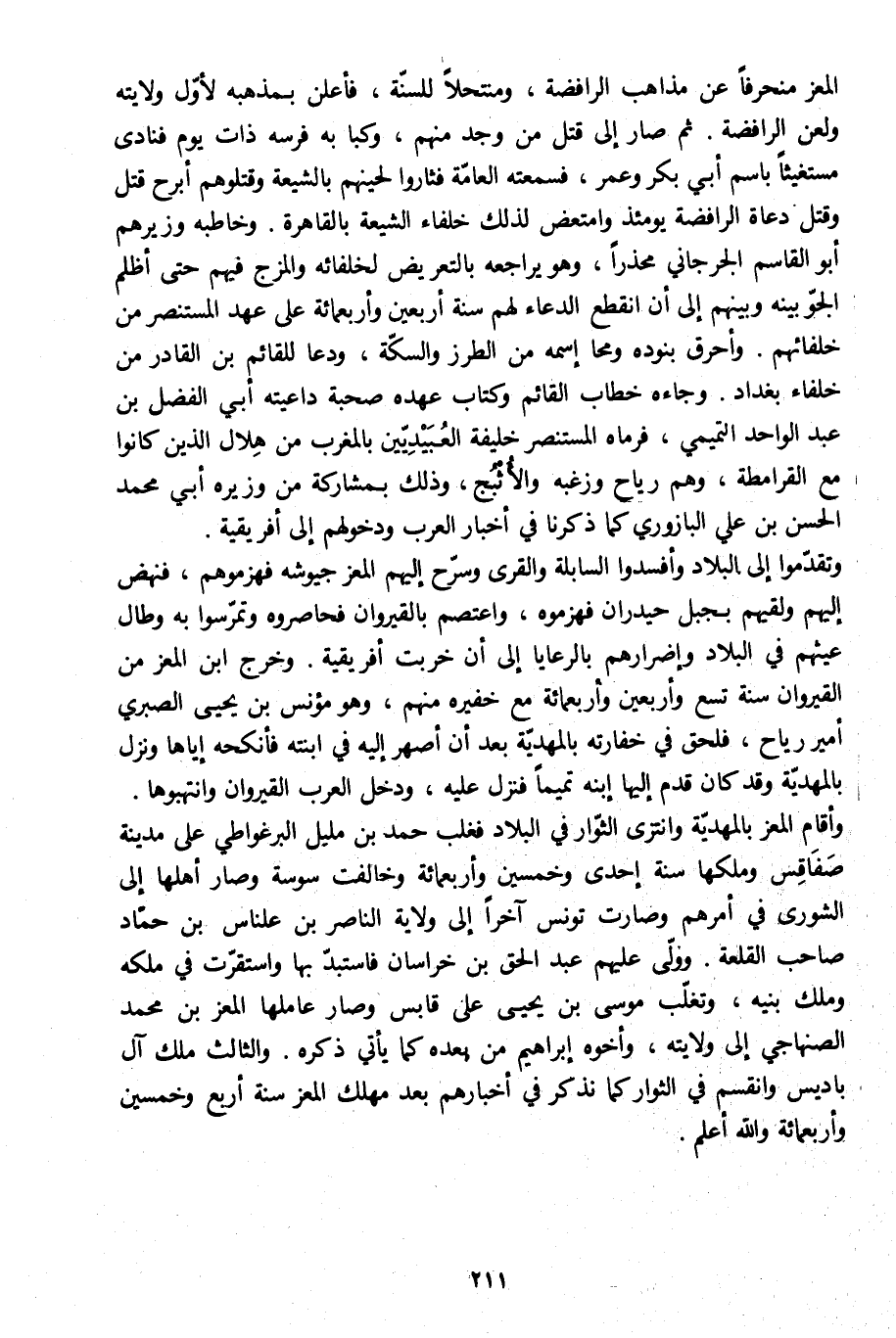 المعز منحرفا عن مذاهب الرافضة، ومنتحلا للسنّة، فأعلن بمذهبه لأوّل ولايته ولعن الرافضة. ثم صار إلى قتل من وجد منهم، وكبا به فرسه ذات يوم فنادى مستغيثا باسم أبي بكر وعمر، فسمعته العامّة فثاروا لحينهم بالشيعة وقتلوهم أبرح قتل وقتل دعاة الرافضة يومئذ وامتعض لذلك خلفاء الشيعة بالقاهرة. وخاطبه وزيرهم أبو القاسم الجرجاني محذرا، وهو يراجعه بالتعريض لخلفائه والمزج فيهم حتى أظلم الجوّ بينه وبينهم إلى أن انقطع الدعاء لهم سنة أربعين وأربعمائة على عهد المستنصر من خلفائهم. وأحرق بنوده ومحا اسمه من الطرز والسكّة، ودعا للقائم بن القادر من خلفائهم. وأحرق بنوده ومحا اسمه من الطرز والسكّة، ودعا للقائم بن القادر من خلفاء بغداد. وجاءه خطاب القائم وكتاب عهده صحبة داعيته أبي الفضل بن عبد الواحد التميمي، فرماه المستنصر خليفة العبيديّين بالمغرب من هلال الذين كانوا مع القرامطة، وهم رياح وزغبه والأثبج، وذلك بمشاركة من وزيره أبي محمد الحسن بن علي البازوري كما ذكرنا في أخبار العرب ودخولهم إلى إفريقية.