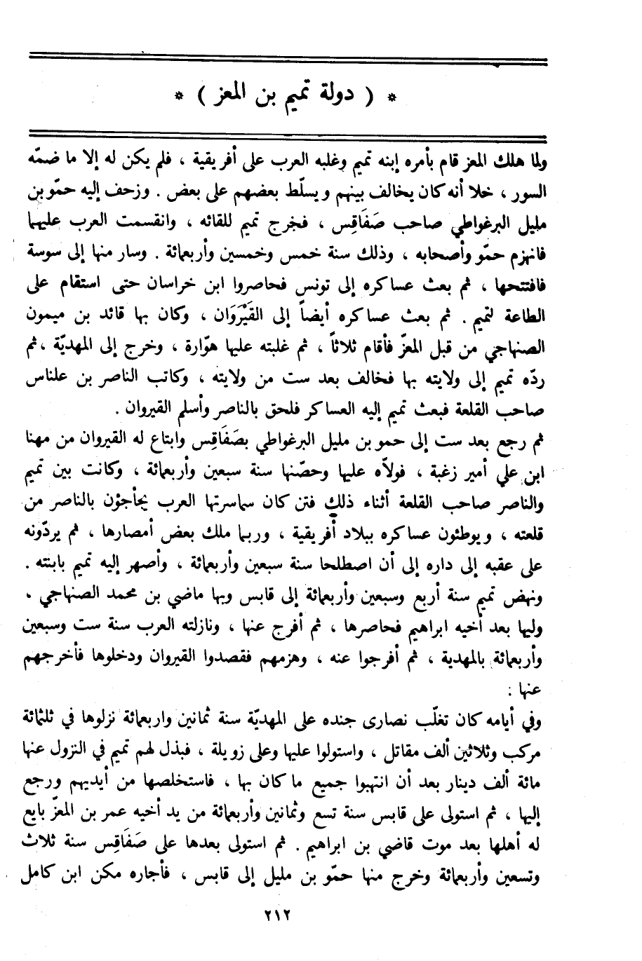 ولما هلك المعز قام بأمره ابنه تميم وغلبه العرب على إفريقية، فلم يكن له إلا ما ضمّه السور، خلا أنه كان يخالف بينهم ويسلّط بعضهم على بعض. وزحف إليه حمّو بن مليل البرغواطي صاحب صفاقس، فخرج تميم للقائه، وانقسمت العرب عليهما فانهزم حمّو وأصحابه، وذلك سنة خمس وخمسين وأربعمائة. وسار منها إلى سوسة فافتتحها، ثم بعث عساكره إلى تونس فحاصروا ابن خراسان حتى استقام على الطاعة لتميم. ثم بعث عساكره أيضا إلى القيروان، وكان بها قائد بن ميمون الصنهاجي من قبل المعزّ فأقام ثلاثا، ثم غلبته عليها هوّارة، وخرج إلى المهديّة، ثم ردّه تميم إلى ولايته بها فخالف بعد ست من ولايته، وكاتب الناصر بن علناس صاحب القلعة فبعث تميم إليه العساكر فلحق بالناصر وأسلم القيروان.