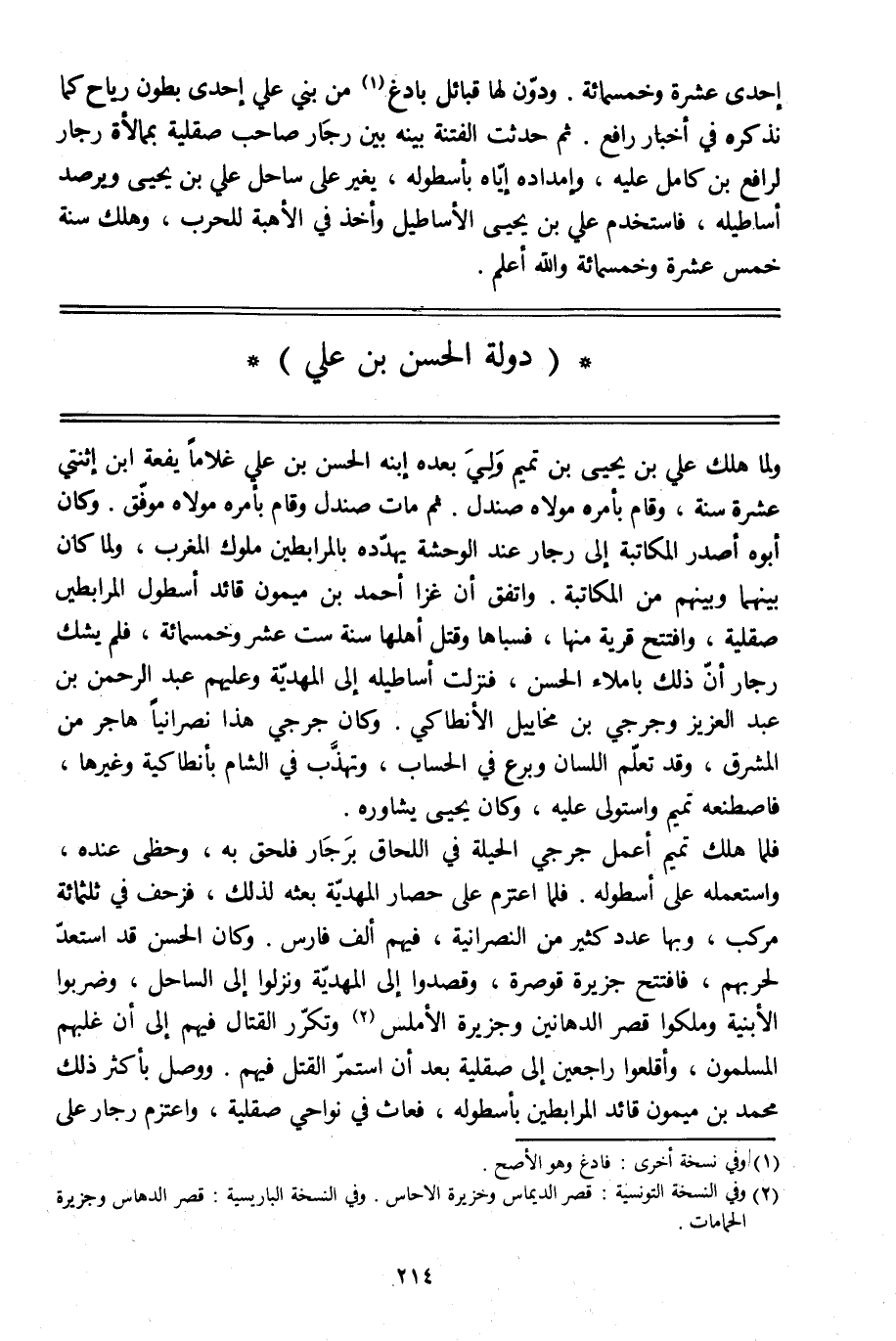 [2] وفي النسخة التونسية: قصر الديماس وجزيرة الاحاس. وفي النسخة الباريسية: قصر الدهاس وجزيرة الحمامات.