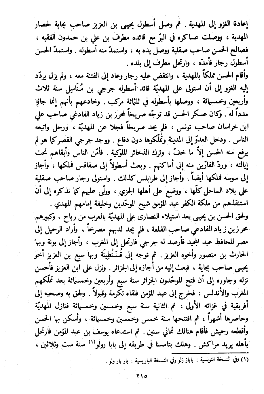 وأقام الحسن مملكا بالمهدية، وانتقض عليه رجار وعاد إلى الفتنة معه، ولم يزل يردّد إليه الغزو إلى أن استولى على المهديّة قائد أسطوله جرجي بن مناسل سنة ثلاث وأربعين وخمسمائة، ووصلها بأسطوله في ثلاثمائة مركب. وخادعهم بأنهم إنما جاءوا مددا له. وكان عسكر الحسن قد توجّه صريخا لمحرز بن زياد الفادغي صاحب علي ابن خراسان صاحب تونس، فلم يجد صريخا فجلا عن المهديّة، ورحل واتبعه الناس. ودخل العدوّ إلى المدينة وتملّكوها دون دفاع. ووجد جرجي القصر كما هو لم يرفع منه الحسن إلّا ما خفّ، وترك الذخائر الملوكية. فأمّن الناس وأبقاهم تحت إيالته، وردّ الفارّين منه إلى أماكنهم. وبعث أسطولا إلى صفاقس فملكها، وأجاز إلى سوسه فملكها أيضا. وأجاز إلى طرابلس كذلك. واستولى رجار صاحب صقلّيّة على بلاد الساحل كلّها، ووضع على أهلها الجزي، وولّى عليهم كما نذكره إلى أن استنقذهم من ملكة الكفر عبد المؤمن شيخ الموحّدين وخليفة إمامهم المهدي.