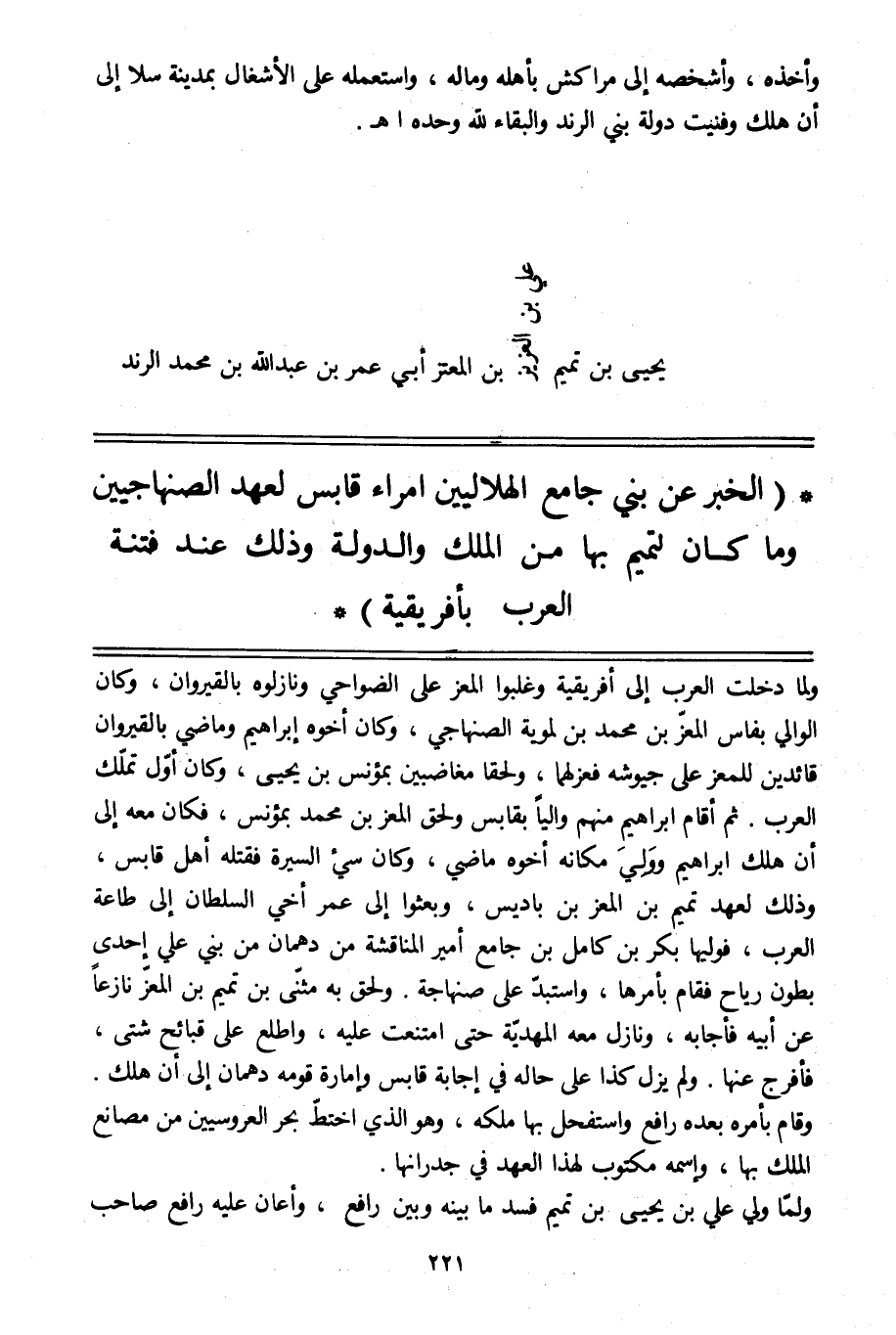 (الخبر عن بني جامع الهلاليين أمراء قابس لعهد الصنهاجيين وما كان لتميم بها من الملك والدولة وذلك عند فتنة العرب بإفريقية)
