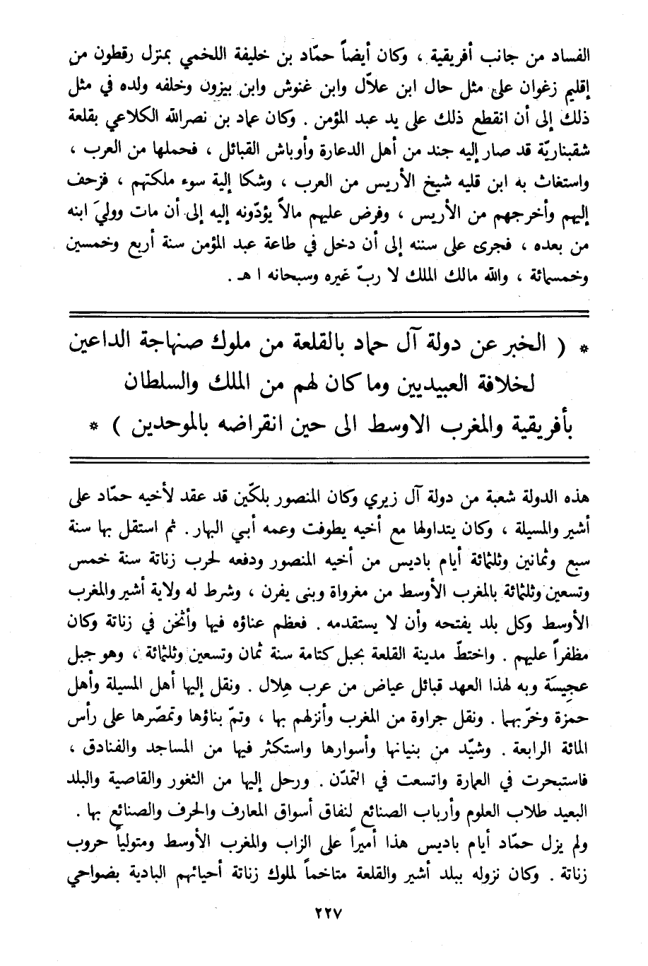 (الخبر عن دولة آل حماد بالقلعة من ملوك صنهاجة الداعين لخلافة العبيديين وما كان لهم من الملك والسلطان بإفريقية والمغرب الأوسط الى حين انقراضه بالموحدين)