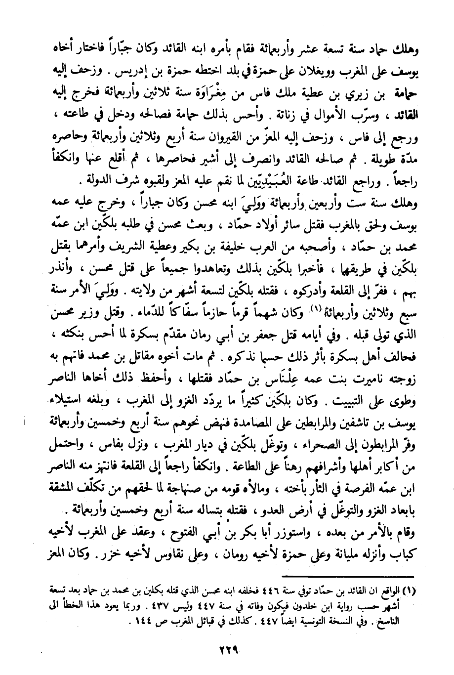 [1] الواقع ان القائد بن حمّاد توفي سنة 446 فخلفه ابنه محسن الّذي قتله بكلين بن محمد بن حماد بعد تسعة أشهر حسب رواية ابن خلدون فيكون وفاته في سنة 447 وليس 437. وربما يعود هذا الخطأ الى الناسخ. وفي النسخة التونسية أيضا 447. كذلك في قبائل المغرب ص 144.