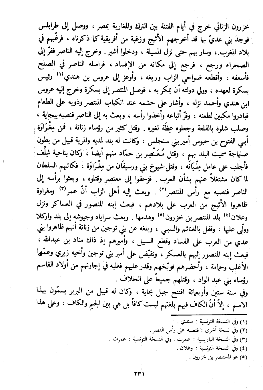 خزرون الزناتي خرج في أيام الفتنة بين الترك والمغاربة بمصر، ووصل إلى طرابلس فوجد بني عديّ بها قد أخرجهم الأثبج وزغبة من إفريقية كما ذكرناه، فرغّبهم في بلاد المغرب، وسار بهم حتى نزل المسيلة، ودخلوا أشير. وخرج إليه الناصر ففرّ إلى الصحراء ورجع، فرجع إلى مكانه من الإفساد، فراسله الناصر في الصلح فأسعفه، وأقطعه ضواحي الزاب وريغه، وأوعز إلى عروس بن هندي [1] رئيس بسكرة لعهده، وولي دولته أن يمكر به، فوصل المنتصر إلى بسكرة وخرج إليه عروس ابن هندي وأحمد نزله، وأشار على حشمه عند انكباب المنتصر وذويه على الطعام فبادروا مكبين لطعنه، وفرّ أتباعه وأخذوا رأسه، وبعث به إلى الناصر فنصبه ببجاية، وصلب شلوه بالقلعة وجعلوه عظة لغيره. وقتل كثير من رؤساء زناتة، فمن مغراوة أبي الفتوح بن حبوس أمير بني سنجلس، وكانت له بلد لمديه والمرية قبيل من بطون صنهاجة سميت البلد بهم، وقتل معنصر بن حمّاد منهم أيضا، وكان بناحية شلّف فأجلب على عامل مليانه، وقتل شيوخ بني ورسيفان من مغراوة، فكاتبهم السلطان لما كان مشتغلا عنهم بشأن العرب. فزحفوا إلى معنصر وقتلوه، وبعثوا برأسه إلى الناصر فنصبه مع رأس المستنصر [2] . وبعث إليه أهل الزاب أنّ عمر [3] ومغراوة ظاهروا الأثبج من العرب على بلادهم، فبعث ابنه المنصور في العساكر ونزل وعلان [4] بلد المنتصر بن خزرون [5] وهدمها. وبعث سراياه وجيوشه إلى بلد واركلا وولّى عليها، وقفل بالغنائم والسبي، وبلغه عن بني توجين من زناتة أنهم ظاهروا بني عدي من العرب على الفساد وقطع السبيل، وأميرهم إذ ذاك مناد بن عبد الله، فبعث ابنه المنصور إليهم بالعسكر، وتقبّض على أمير بني توجين وأخيه زيري وعمّهما الأغلب وحمامة، وأحضرهم فوبّخهم وقدر عليهم فغلبه في إجارتهم من أولاد القاسم رؤساء بني عبد الواد، وقتلهم جميعا على الخلاف.