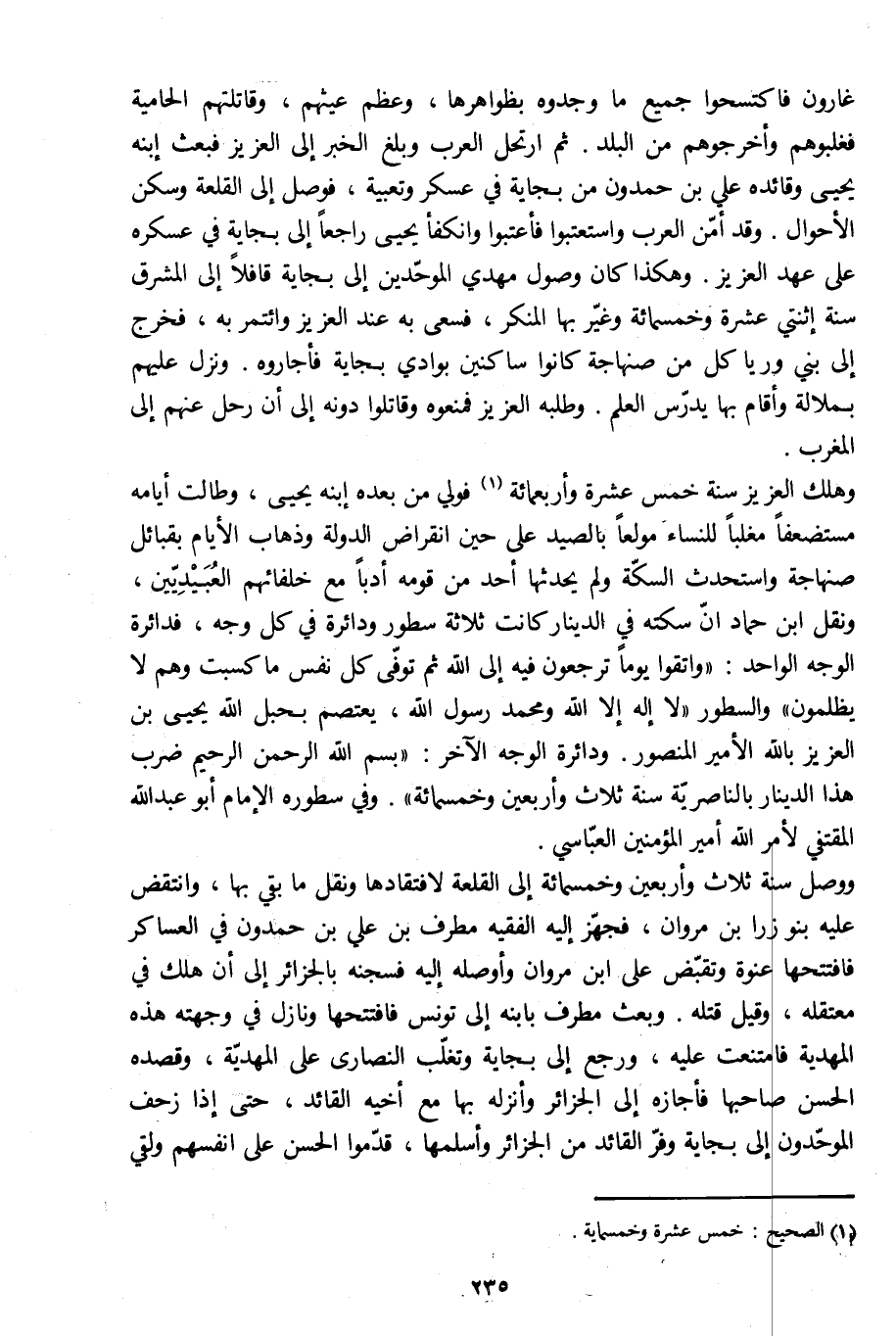 وهلك العزيز سنة خمس عشرة وأربعمائة [1] فولي من بعده ابنه يحيى، وطالت أيامه مستضعفا مغلبا للنساء مولعا بالصيد على حين انقراض الدولة وذهاب الأيام بقبائل صنهاجة واستحدث السكّة ولم يحدثها أحد من قومه أدبا مع خلفائهم العبيديّين، ونقل ابن حماد انّ سكته في الدينار كانت ثلاثة سطور ودائرة في كل وجه، فدائرة الوجه الواحد: «وَاتَّقُوا يَوْماً تُرْجَعُونَ فِيهِ إِلَى الله ثُمَّ تُوَفَّى كُلُّ نَفْسٍ ما كَسَبَتْ وَهُمْ لا يُظْلَمُونَ» 2: 281 والسطور «لا إله إلا الله ومحمد رسول الله، يعتصم بحبل الله يحيى بن العزيز باللَّه الأمير المنصور. ودائرة الوجه الآخر: «بِسْمِ الله الرَّحْمنِ الرَّحِيمِ 1: 1 ضرب هذا الدينار بالناصريّة سنة ثلاث وأربعين وخمسمائة» . وفي سطوره الإمام أبو عبد الله المقتفي لأمر الله أمير المؤمنين العبّاسي.