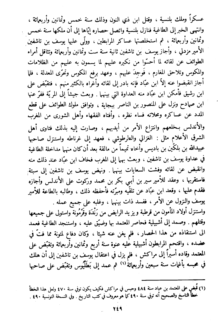 [1] قبض على المعتمد بن عباد سنة 484 وحبس في مراكش فكيف يكون توفي سنة 470 ولعل هذا الخطأ خطأ الناسخ والصحيح أنه توفي سنة 490 كما هو معروف في كتب التاريخ. وفي النسخة التونسية 490.
