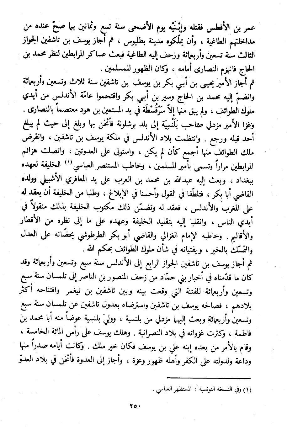وغزا الأمير مزدلي صاحب بلنسية إلى بلد برشلونة فأثخن بها وبلغ إلى حيث لم يبلغ أحد قبله ورجع. وانتظمت بلاد الأندلس في ملكة يوسف بن تاشفين، وانقرض ملك الطوائف منها أجمع كأن لم يكن، واستولى على العدوتين، واتصلت هزائم المرابطين مرارا وتسمى بأمير المسلمين، وخاطب المستنصر العباسي [1] الخليفة لعهده ببغداد، وبعث إليه عبد الله بن محمد بن العرب على يد المعافري الإشبيلي وولده القاضي أبا بكر، فتلطّفا في القول وأحسنا في الإبلاغ، وطلبا من الخليفة أن يعقد له على المغرب والأندلس، فعقد له وتضمّن ذلك مكتوب الخليفة بذلك منقولا في أيدي الناس، وانقلبا إليه بتقليد الخليفة وعهده على ما إلى نظره من الأقطار والأقاليم. وخاطبه الإمام الغزالي والقاضي أبو بكر الطرطوشي يحضّانه على العدل والتمسّك بالخير، ويفتيانه في شأن ملوك الطوائف بحكم الله.