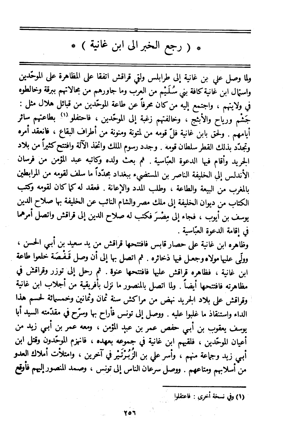 جشم ورياح والأبثج، وخالفتهم زغبة إلى الموحّدين، فاحتفلوا [1] بطاعتهم سائر أيامهم. ولحق بابن غانية فلّ قومه من لمتونة ومنونة من أطراف البقاع، فانعقد أمره وتجدّد بذلك القطر سلطان قومه. وجدد رسوم الملك واتخذ الآلة وافتتح كثيرا من بلاد الجريد وأقام فيها الدعوة العبّاسية. ثم بعث ولده وكاتبه عبد المؤمن من فرسان الأندلس إلى الخليفة الناصر بن المستضيء ببغداد مجدّدا ما سلف لقومه من المرابطين بالمغرب من البيعة والطاعة، وطلب المدد والإعانة. فعقد له كما كان لقومه وكتب الكتاب من ديوان الخليفة إلى ملك مصر والشام النائب عن الخليفة بها صلاح الدين يوسف بن أيوب، فجاء إلى مصر فكتب له صلاح الدين إلى قراقش واتصل أمرهما في إقامة الدعوة العبّاسية.