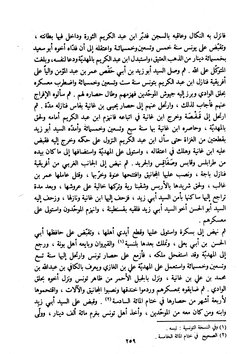 ثم نهض إلى بسكرة واستولى عليها وقطع أيدي أهلها، وتقبّض على حافظها أبي الحسن بن أبي يعلى، وتملك بعدها بلنسية [1] والقيروان وبايعه أهل بونة، ورجع إلى المهديّة وقد استفحل ملكه، فأزمع على حصار تونس وارتحل إليها سنة تسع وتسعين وخمسمائة واستعمل على المهديّة علي بن الغازي ويعرف بالكافي بن عبد الله بن محمد بن علي بن غانية، ونزل بالجبل الأحمر من ظاهر تونس ونزل أخوه بحلق الوادي. ثم ضايقوه بمعسكرهم وردموا خندقها ونصبوا المجانيق والآلات، واقتحموها لأربعة أشهر من حصارها في ختام المائة السادسة [2] . وقبض على السيد أبي زيد وابنه ومن كان معه من الموحّدين، وأخذ أهل تونس بغرم مائة ألف دينار، وولّى