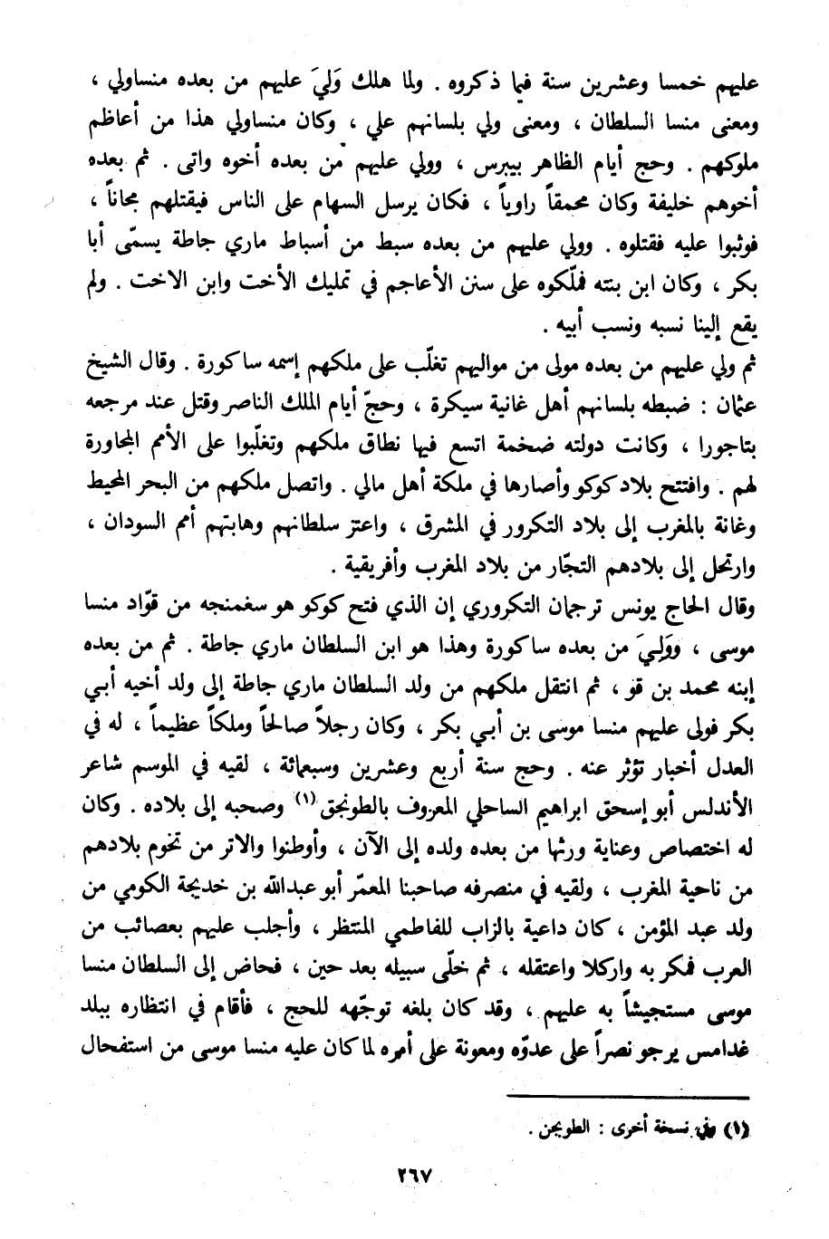 وقال الحاج يونس ترجمان التكروري إن الّذي فتح كوكو هو سغمنجة من قوّاد منسا موسى، وولي من بعده ساكورة وهذا هو ابن السلطان ماري جاطة. ثم من بعده ابنه محمد بن قو، ثم انتقل ملكهم من ولد السلطان ماري جاطة إلى ولد أخيه أبي بكر فولى عليهم منسا موسى بن أبي بكر، وكان رجلا صالحا وملكا عظيما، له في العدل أخبار تؤثر عنه. وحج سنة أربع وعشرين وسبعمائة، لقيه في الموسم شاعر الأندلس أبو إسحاق إبراهيم الساحلي المعروف بالطونجق [1] وصحبه إلى بلاده. وكان له اختصاص وعناية ورثها من بعده ولده إلى الآن، وأوطنوا والاتر من تخوم بلادهم من ناحية المغرب، ولقيه في منصرفه صاحبنا المعمّر أبو عبد الله بن خديجة الكومي من ولد عبد المؤمن، كان داعية بالزاب للفاطمي المنتظر، وأجلب عليهم بعصائب من العرب فمكر به واركلا واعتقله، ثم خلّى سبيله بعد حين، فحاض إلى السلطان منسا موسى مستجيشا به عليهم، وقد كان بلغه توجّهه للحج، فأقام في انتظاره ببلد غدامس يرجو نصرا على عدوّه ومعونة على أمره لما كان عليه منسا موسى من استفحال