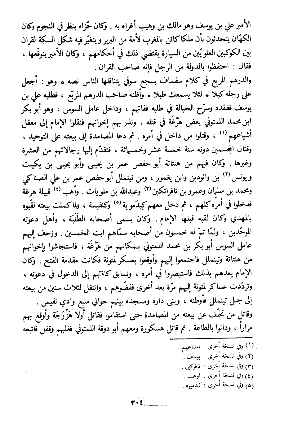 والدرهم المربع في كلام سفساف بسجع سوقي يتناقلها الناس نصه وهو: أجعل على رجله كبلا لئلا يسمعك طبلا وأظنه صاحب الدرهم المربّع، فطلبه علي بن يوسف ففقده وسرّح الخيالة في طلبه ففاتهم، وداخل عامل السوس، وهو أبو بكر ابن محمد اللمتوني بعض هرغة في قتله، ونذر بهم إخوانهم فنقلوا الإمام إلى معقل أشياعهم [1] ، وقتلوا من داخل في أمره. ثم دعا المصامدة إلى بيعته على التوحيد، وقتال المجسمين دونه سنة خمسة عشر وخمسمائة، فتقدّم إليها رجالاتهم من العشرة وغيرها. وكان فيهم من هنتاتة أبو حفص عمر بن يحيى وأبو يحيى بن يكيبت ويونس [2] بن وانودين وابن يغمور، ومن تين ملّل أبو حفص عمر بن علي الصناكي ومحمد بن سليمان وعمرو بن تافراتكين [3] وعبد الله بن ملويات. وأهب [4] قبيلة هرغة فدخلوا في أمره كلهم، ثم دخل معهم كيدموية [5] وكنفيسة، ولما كملت بيعته لقّبوه بالمهديّ وكان لقبه قبلها الإمام. وكان يسمى أصحابه الطلبة، وأهل دعوته الموحّدين، ولمّا تمّ له خمسون من أصحابه سمّاهم ايت الخمسين. وزحف إليهم عامل السوس أبو بكر بن محمد اللمتوني بمكانهم من هرغة، فاستجاشوا بإخوانهم من هنتاتة وتين ملّل فاجتمعوا إليهم وأوقعوا بعسكر لمتونة فكانت مقدمة الفتح. وكان الإمام يعدهم بذلك فاستبصروا في أمره، وتسابق كافتهم إلى الدخول في دعوته، وتردّدت عساكر لمتونة إليهم مرّة بعد أخرى ففضّوهم، وانتقل لثلاث سنين من بيعته إلى جبل تين ملّل فأوطنه، وبنى داره ومسجده بينهم حوالي منبع وادي نفيس.