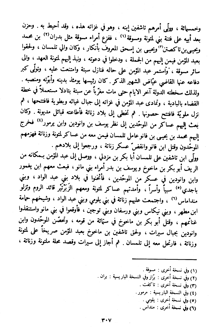 وخمسمائة، وولّى أمرهم تاشفين ابنه، وهو في غزاته هذه، وقد أحيط به. وحزن بعد أبيه على فتنة بني لمتونة ومسوقة [1] ، ففزع أمراء مسوقة مثل بدران [2] بن محمد ويحيى بن تاكصتن [3] ويحيى بن إسحاق المعروف بأنكار، وكان والي تلمسان، ولحقوا بعبد المؤمن فيمن إليهم من الجملة، ودخلوا في دعوته، ونبذ إليهم لمتونة العهد، وإلى سائر مسوقة، واستمر عبد المؤمن على حاله فنازل سبتة وامتنعت عليه، وتولّى كبر دفاعه عنها القاضي عيّاض الشهير الذكر. كان رئيسها يومئذ بدينه وأبوّته ومنصبه.