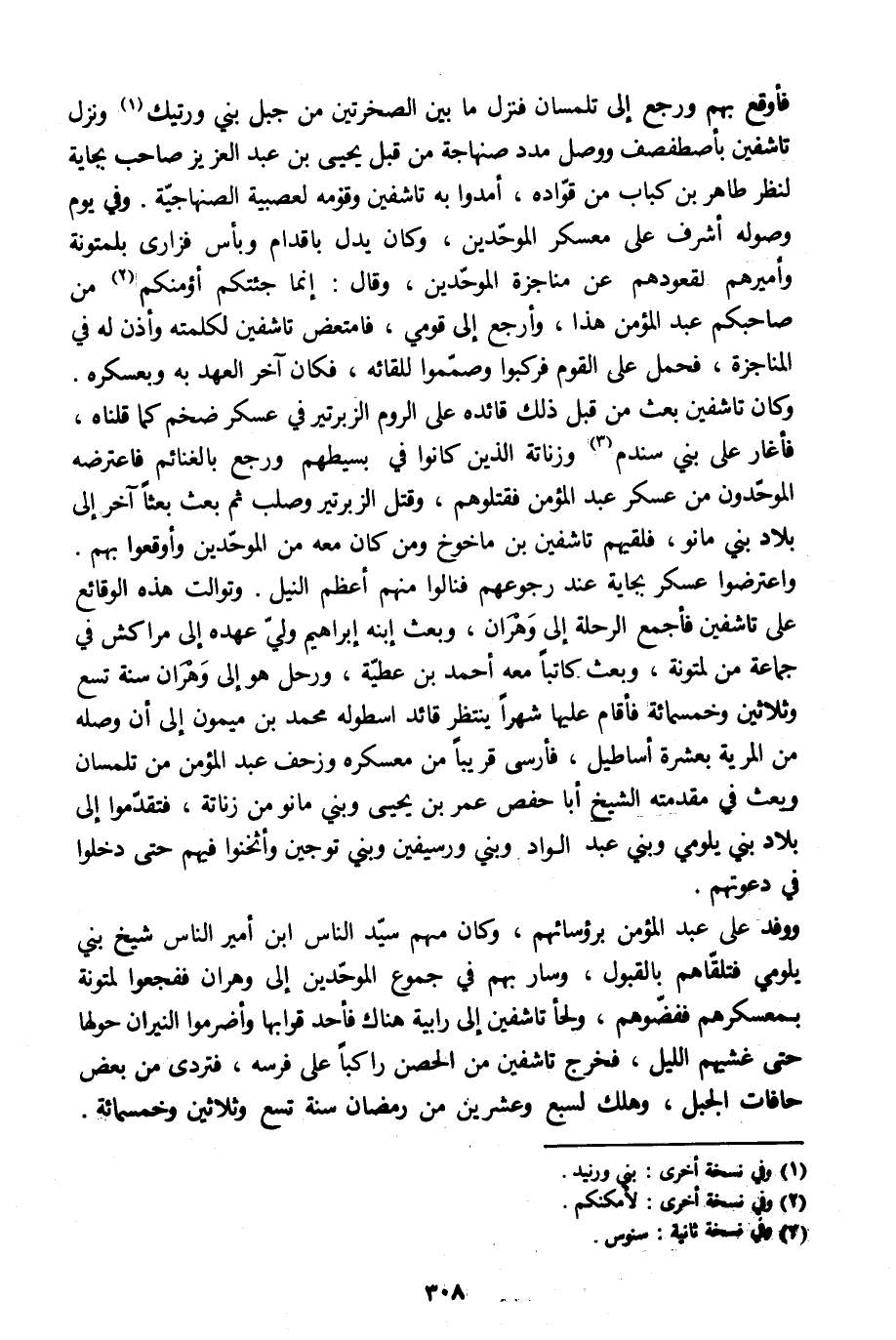 فأوقع بهم ورجع إلى تلمسان فنزل ما بين الصخرتين من جبل بني ورتيك [1] ونزل تاشفين بأصطفصف ووصل مدد صنهاجة من قبل يحيى بن عبد العزيز صاحب بجاية لنظر طاهر بن كباب من قوّاده، أمدوا به تاشفين وقومه لعصبية الصنهاجيّة. وفي يوم وصوله أشرف على معسكر الموحّدين، وكان يدل باقدام وبأس فزاري بلمتونة وأميرهم لقعودهم عن مناجزة الموحّدين، وقال: إنما جئتكم أؤمنكم [2] من صاحبكم عبد المؤمن هذا، وأرجع إلى قومي، فامتعض تاشفين لكلمته وأذن له في المناجزة، فحمل على القوم فركبوا وصمّموا للقائه، فكان آخر العهد به وبعسكره.
