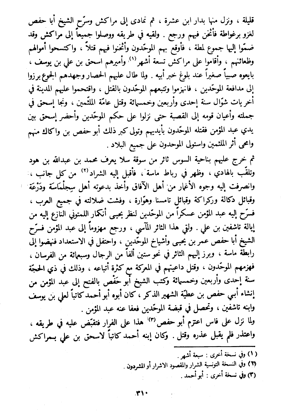 قليلة، ونزل منها بدار ابن عشرة، ثم تمادى إلى مراكش وسرّح الشيخ أبا حفص لغزو برغواطة فأثخن فيهم ورجع. ولقيه في طريقه ووصلوا جميعا إلى مراكش وقد ضمّوا إليها جموع لمطة، فأوقع بهم الموحّدون وأثخنوا فيهم قتلا، واكتسحوا أموالهم وظعائنهم، وأقاموا على مراكش تسعة أشهر [1] وأميرهم إسحاق بن علي بن يوسف، بايعوه صبيا صغيرا عند بلوغ خبر أبيه. ولما طال عليهم الحصار وجهدهم الجوع برزوا إلى مدافعة الموحّدين، فانهزموا وتتبعهم الموحّدون بالقتل، واقتحموا عليهم المدينة في أخريات شوّال سنة إحدى وأربعين وخمسمائة وقتل عامّة الملثّمين، ونجا إسحاق في جملته وأعيان قومه إلى القصبة حتى نزلوا على حكم الموحّدين وأحضر إسحاق بين جملته وأعيان قومه إلى القصبة حتى نزلوا على حكم الموحّدين وأحضر إسحاق بين يدي عبد المؤمن فقتله الموحّدون بأيديهم وتولى كبر ذلك أبو حفص بن واكاك منهم وامحى أثر الملثمين واستولى الموحدون على جميع البلاد.