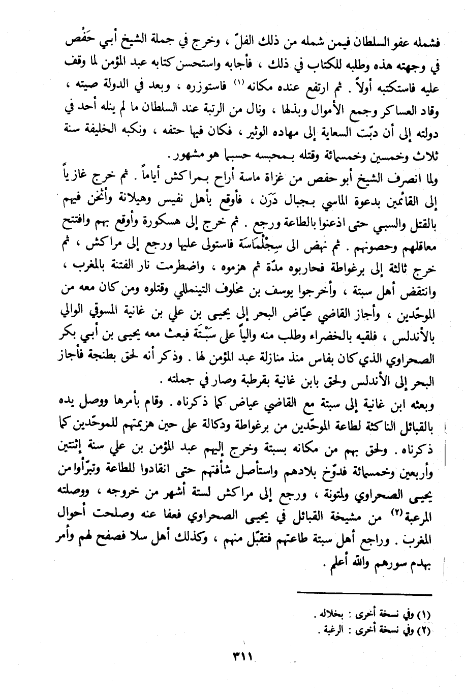 وبعثه ابن غانية إلى سبتة مع القاضي عياض كما ذكرناه. وقام بأمرها ووصل يده بالقبائل الناكثة لطاعة الموحّدين من برغواطة ودكالة على حين هزيمتهم للموحّدين كما ذكرناه. ولحق بهم من مكانه بسبتة وخرج إليهم عبد المؤمن بن علي سنة اثنتين وأربعين وخمسمائة فدوّخ بلادهم واستأصل شأفتهم حتى انقادوا للطاعة وتبرّءوا من يحيى الصحراوي ولمتونة، ورجع إلى مراكش لستة أشهر من خروجه، ووصلته المرعبة [2] من مشيخة القبائل في يحيى الصحراوي فعفا عنه وصلحت أحوال المغرب. وراجع أهل سبتة طاعتهم فتقبّل منهم، وكذلك أهل سلا فصفح لهم وأمر بهدم سورهم والله أعلم.