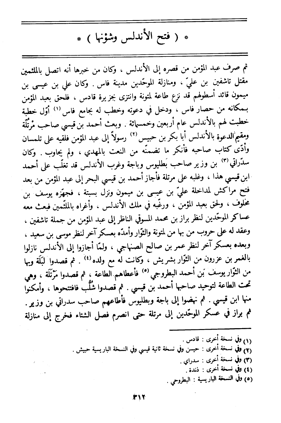 ثم صرف عبد المؤمن من قصره إلى الأندلس، وكان من خبرها أنه اتصل بالملثمين مقتل تاشفين بن عليّ، ومنازلة الموحّدين مدينة فاس. وكان علي بن عيسى بن ميمون قائد أسطولهم قد نزع طاعة لمتونة وانتزى بجزيرة قادس، فلحق بعبد المؤمن بمكانه من حصار فاس، ودخل في دعوته وخطب له بجامع فاس [1] أوّل خطبة خطبت لهم بالأندلس عام أربعين وخمسمائة. وبعث أحمد بن قيسي صاحب مرتلّة ومقيم الدعوة بالأندلس أبا بكر بن حبيس [2] رسولا إلى عبد المؤمن فلقيه على تلمسان وأدّى كتاب صاحبه فأنكر ما تضمّنه من النعت بالمهديّ، ولم يجاوب. وكان سدّراتي [3] بن وزير صاحب بطليوس وباجة وغرب الأندلس قد تغلّب على أحمد ابن قيسي هذا، وغلبه على مرتلة فأجاز أحمد بن قيسي البحر إلى عبد المؤمن من بعد فتح مراكش لمداخلة عليّ بن عيسى بن ميمون ونزل بسبتة، فجهّزه يوسف بن مخلوف، ولحق بعبد المؤمن، ورغّبه في ملك الأندلس، وأغراه بالملثّمين فبعث معه عساكر الموحّدين لنظر براز بن محمد المسوقي الناظر إلى عبد المؤمن من جملة تاشفين، وعقد له على حروب من بها من لمتونة والثّوار وأمدّه بعسكر آخر لنظر موسى بن سعيد، وبعده بعسكر آخر لنظر عمر بن صالح الصنهاجي، ولمّا أجازوا إلى الأندلس نازلوا بالغمر بن عزرون من الثّوار بشريش، وكانت له مع ولده [4] . ثم قصدوا لبلة وبها من الثّوار يوسف بن أحمد البطروجي [5] فأعطاهم الطاعة، ثم قصدوا مرتلة، وهي تحت الطاعة لتوحيد صاحبها أحمد بن قيسي. ثم قصدوا شلّب فافتتحوها، وأمكنوا منها ابن قيسي. ثم نهضوا إلى باجة وبطليوس فأطاعهم صاحب سدراتي بن وزير.