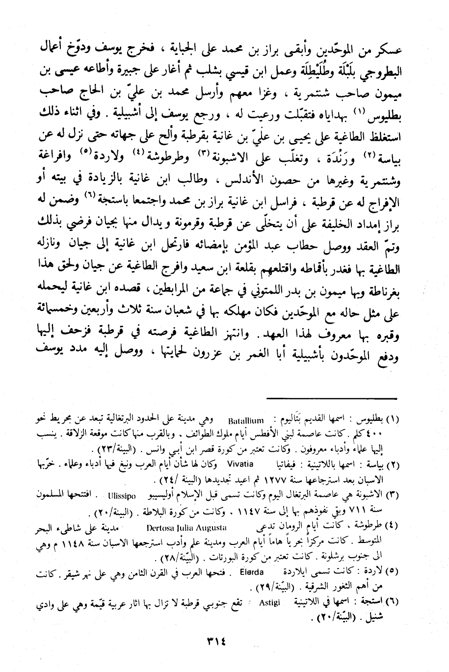 [1] بطليوس: اسمها القديم بتاليوم Batallium:وهي مدينة على الحدود البرتغالية تبعد عن مجريط نحو 400 كلم. كانت عاصمة لبني الأفطس أيام ملوك الطوائف، وبالقرب منها كانت موقعة الزلاقة. ينسب إليها علماء وأدباء معروفون. وكانت تعتبر من كورة قصر ابن أبي وانس. (البينة/ 23) .