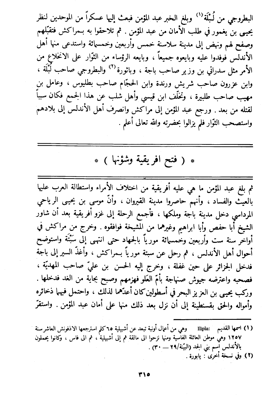 البطروجي من لبلة [1] وبلغ الخبر عبد المؤمن فبعث إليها عسكرا من الموحدين لنظر يحيى بن يغمور في طلب الأمان من عبد المؤمن. ثم تلاحقوا به بمراكش فتقبّلهم وصفح لهم ونهض إلى مدينة سلا سنة خمس وأربعين وخمسمائة واستدعى منها أهل الأندلس فوفدوا عليه وبايعوه جميعا، وبايعه الرؤساء من الثوّار على الانخلاع من الأمر مثل سدراتي بن وزير صاحب باجة، وباثورة [2] والبطروجي صاحب لبلة، وابن عزرون صاحب شريش ورندة وابن الحجّام صاحب بطليوس، وعامل بن مهيب صاحب طلبيرة، وتخلّف ابن قيسي وأهل شلب عن هذا الجمع فكان سببا لقتله من بعد. ورجع عبد المؤمن إلى مراكش وانصرف أهل الأندلس إلى بلادهم واستصحب الثّوار فلم يزالوا بحضرته والله تعالى أعلم.