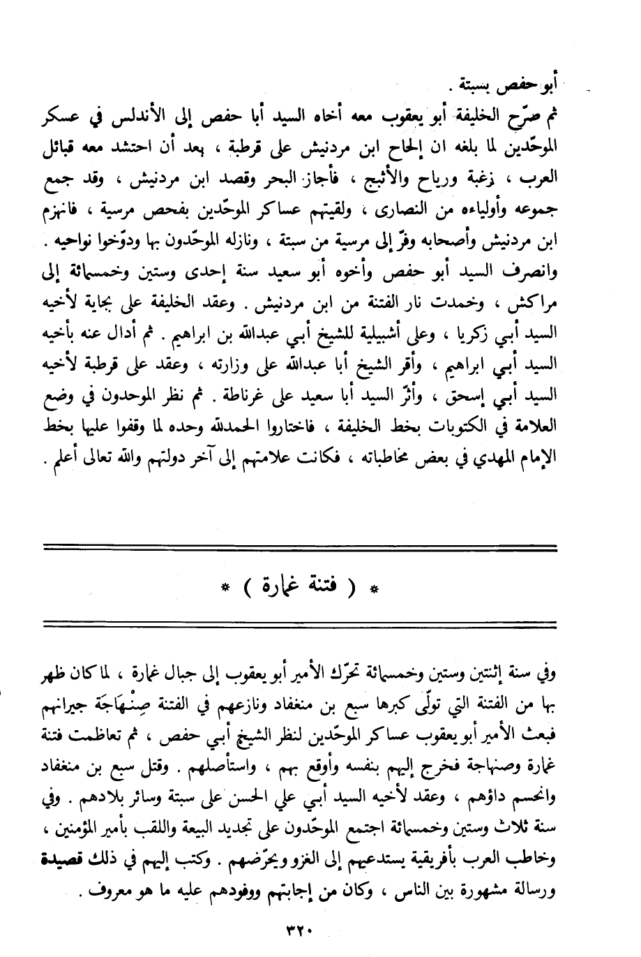 وانصرف السيد أبو حفص وأخوه أبو سعيد سنة إحدى وستين وخمسمائة إلى مراكش، وخمدت نار الفتنة من ابن مردنيش. وعقد الخليفة على بجاية لأخيه السيد أبي زكريا، وعلى إشبيليّة للشيخ أبي عبد الله بن إبراهيم. ثم أدال عنه بأخيه السيد أبي إبراهيم، وأقر الشيخ أبا عبد الله على وزارته، وعقد على قرطبة لأخيه السيد أبي إسحاق، وأثر السيد أبا سعيد على غرناطة. ثم نظر الموحدون في وضع العلامة في المكتوبات بخط الخليفة، فاختاروا الحمد للَّه وحده لما وقفوا عليها بخط الإمام المهدي في بعض مخاطباته، فكانت علامتهم إلى آخر دولتهم والله تعالى أعلم.