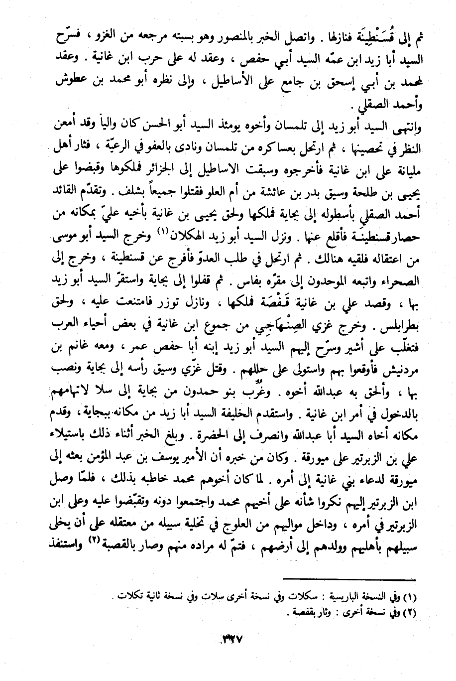 وانتهى السيد أبو زيد إلى تلمسان وأخوه يومئذ السيد أبو الحسن كان واليا وقد أمعن النظر في تحصينها، ثم ارتحل بعساكره من تلمسان ونادى بالعفو في الرعيّة، فثار أهل مليانة على ابن غانية فأخرجوه وسبقت الاساطيل إلى الجزائر فملكوها وقبضوا على يحيى بن طلحة وسيق بدر بن عائشة من أم العلو فقتلوا جميعا بشلف. وتقدّم القائد أحمد الصقلي بأسطوله إلى بجاية فملكها ولحق يحيى بن غانية بأخيه عليّ بمكانه من حصار قسنطينة فأقلع عنها. ونزل السيد أبو زيد الهكلان [1] وخرج السيد أبو موسى من اعتقاله فلقيه هنالك. ثم ارتحل في طلب العدوّ فأفرج عن قسنطينة، وخرج إلى الصحراء واتبعه الموحدون إلى مقرّه بفاس. ثم قفلوا إلى بجاية واستقرّ السيد أبو زيد بها، وقصد علي بن غانية قفصة فملكها، ونازل توزر فامتنعت عليه، ولحق بطرابلس. وخرج غزي الصنهاجي من جموع ابن غانية في بعض أحياء العرب فتغلّب على أشير وسرّح إليهم السيد أبو زيد ابنه أبا حفص عمر، ومعه غانم بن مردنيش فأوقعوا بهم واستولى على حللهم. وقتل غزّي وسيق رأسه إلى بجاية ونصب بها، وألحق به عبد الله أخوه. وغرّب بنو حمدون من بجاية إلى سلا لاتهامهم بالدخول في أمر ابن غانية. واستقدم الخليفة السيد أبا زيد من مكانه ببجاية، وقدم مكانه أخاه السيد أبا عبد الله وانصرف إلى الحضرة. وبلغ الخبر أثناء ذلك باستيلاء علي بن الزبرتير على ميورقة. وكان من خبره أن الأمير يوسف بن عبد المؤمن بعثه إلى ميورقة لدعاء بني غانية إلى أمره. لما كان أخوهم محمد خاطبه بذلك، فلمّا وصل ابن الزبرتير إليهم نكروا شأنه على أخيهم محمد واجتمعوا دونه وتقبّضوا عليه وعلى ابن الزبرتير في أمره، وداخل مواليهم من العلوج في تخلية سبيله من معتقله على أن يخلى سبيلهم بأهليهم وولدهم إلى أرضهم، فتمّ له مراده منهم وصار بالقصبة [2] واستنفذ