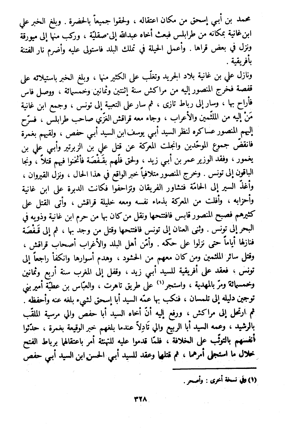 ونازل علي بن غانية بلاد الجريد وتغلّب على الكثير منها، وبلغ الخبر باستيلائه على قفصة فخرج المنصور إليه من مراكش سنة اثنتين وثمانين وخمسمائة، ووصل فاس فأراح بها، وسار إلى رباط تازى، ثم سار على التعبية إلى تونس، وجمع ابن غانية من إليه من الملثّمين والأعراب، وجاء معه قراقش الغزّي صاحب طرابلس، فسرّح إليهم المنصور عساكره لنظر السيد أبي يوسف ابن السيد أبي حفص، ولقيهم بغمرة فانقضّ جموع الموحّدين وانجلت المعركة عن قتل علي بن الزبرتير وأبي علي بن يغمور، وفقد الوزير عمر بن أبي زيد، ولحق فلّهم بقفصة فأثخنوا فيهم قتلا، ونجا الباقون إلى تونس. وخرج المنصور متلافيا خبر الواقع في هذا الحال، ونزل القيروان، وأغذّ السير إلى الحامّة فتشاور الفريقان وتزاحفوا فكانت الدبرة على ابن غانية وأحزابه، وأفلت من المعركة بذماء نفسه ومعه خليلة قراقش، وأتى القتل على كثيرهم فصبح المنصور قابس فافتتحها ونقل من كان بها من حرم ابن غانية وذويه في البحر إلى تونس. وثنى العنان إلى تونس فافتتحها وقتل من وجد بها، ثم إلى قفصة فنازلها أياما حتى نزلوا على حكمه. وأمّن أهل البلد والأغراب أصحاب قراقش، وقتل سائر الملثمين ومن كان معهم من الحشود، وهدم أسوارها وانكفأ راجعا إلى تونس، فعقد على إفريقية للسيد أبي زيد، وقفل إلى المغرب سنة أربع وثمانين وخمسمائة ومرّ بالمهدية، واستجر [1] على طريق تاهرت، والعبّاس بن عطيّة أمير بني توجين دليله إلى تلمسان، فنكب بها عمّه السيد أبا إسحاق لشيء بلغه عنه وأحفظه.