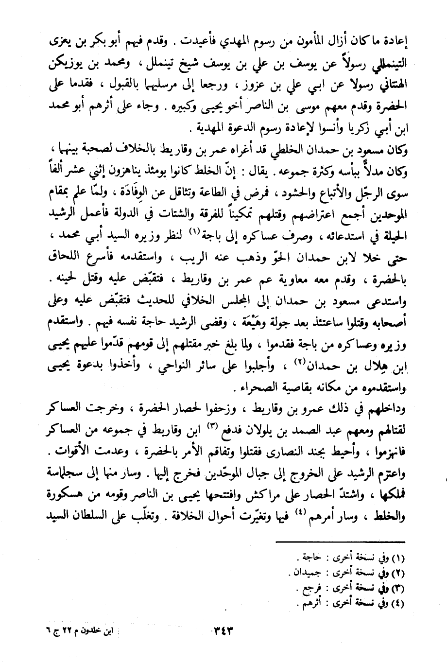 واستدعى مسعود بن حمدان إلى المجلس الخلافي للحديث فتقبّض عليه وعلى أصحابه وقتلوا ساعتئذ بعد جولة وهيعة، وقضى الرشيد حاجة نفسه فيهم. واستقدم وزيره وعساكره من باجة فقدموا، ولما بلغ خبر مقتلهم إلى قومهم قدّموا عليهم يحيى ابن هلال بن حمدان [2] ، وأجلبوا على سائر النواحي، وأخذوا بدعوة يحيى واستقدموه من مكانه بقاصية الصحراء.