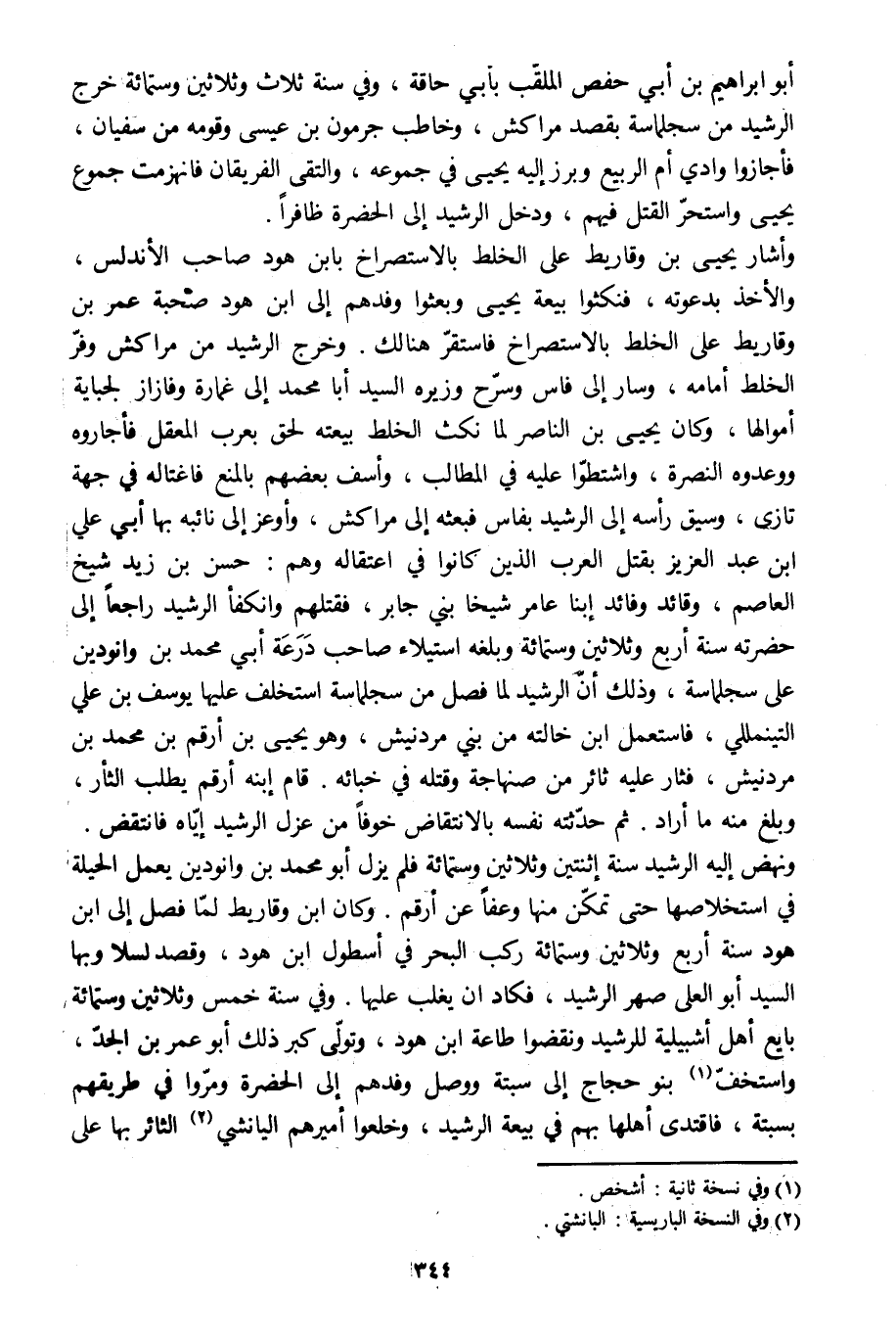 ونهض إليه الرشيد سنة اثنتين وثلاثين وستمائة فلم يزل أبو محمد بن وانودين يعمل الحيلة في استخلاصها حتى تمكّن منها وعفا عن أرقم. وكان ابن وقاريط لمّا فصل إلى ابن هود سنة أربع وثلاثين وستمائة ركب البحر في أسطول ابن هود، وقصد لسلا وبها السيد أبو العلى صهر الرشيد، فكاد ان يغلب عليها. وفي سنة خمس وثلاثين وستمائة بايع أهل إشبيليّة للرشيد ونقضوا طاعة ابن هود، وتولّى كبر ذلك أبو عمر بن الجدّ، واستخفّ [1] بنو حجاج إلى سبتة ووصل وفدهم إلى الحضرة ومرّوا في طريقهم بسبتة، فاقتدى أهلها بهم في بيعة الرشيد، وخلعوا أميرهم اليانشي [2] الثائر بها على