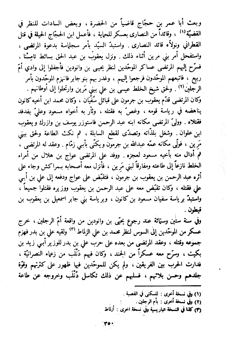 وبعث أبا عمر بن حجّاج قاضيا من الحضرة، وبعض السادات للنظر في القضيّة [1] ، وقائدا من النصارى بعسكر للحماية، فأعمل ابن الحجّاج الحيلة في قتل القطراني وتولّاه قائد النصارى. واستبدّ السيّد بأمر سجلماسة بدعوة المرتضى، واستفحل أمر بني مرين أثناء ذلك. ونزل يعقوب بن عبد الحق بسائط تامسنا، فسرّح إليهم المرتضى عساكر الموحّدين لنظر يحيى بن وانودين فأجفلوا إلى وادي أمّ ربيع، فاتبعهم الموحّدون فرجعوا إليهم، وغدر بهم بنو جابر فانهزم الموحّدون بأمر الرجلين [2] . ولحق شيخ الخلط عيسى بن علي ببني مرين وارتحلوا إلى أوطانهم.