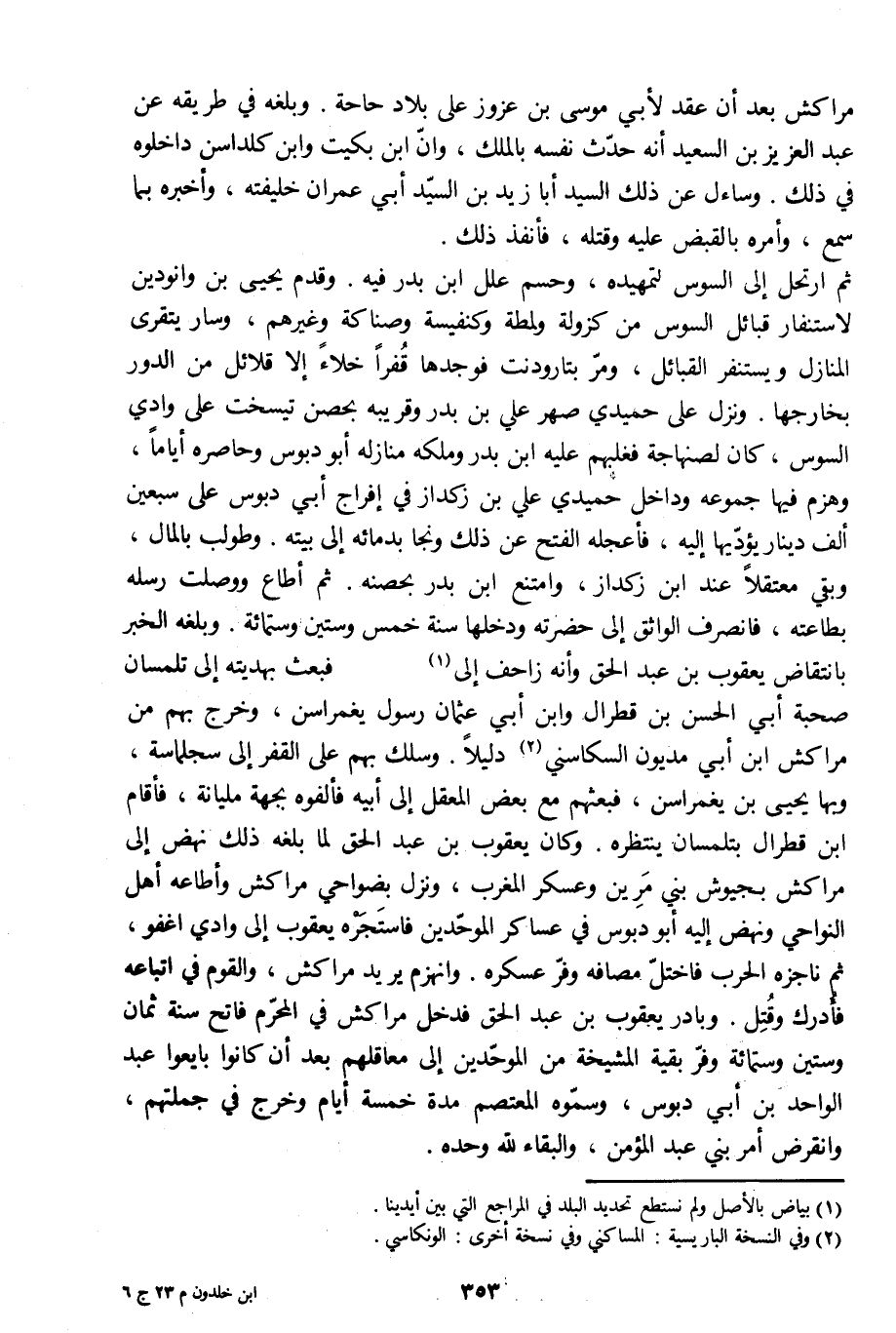 ثم ارتحل إلى السوس لتمهيده، وحسم علل ابن بدر فيه. وقدم يحيى بن وانودين لاستنفار قبائل السوس من كزولة ولمطة وكنفيسة وصناكة وغيرهم، وسار يتقرى المنازل ويستنفر القبائل، ومرّ بتارودنت فوجدها قفرا خلاء إلا قلائل من الدور بخارجها. ونزل على حميدي صهر علي بن بدر وقريبه بحصن تيسخت على وادي السوس، كان لصنهاجة فغلبهم عليه ابن بدر وملكه منازله أبو دبوس وحاصره أياما، وهزم فيها جموعه وداخل حميدي علي بن زكداز في إفراج أبي دبوس على سبعين ألف دينار يؤدّيها إليه، فأعجله الفتح عن ذلك ونجا بدمائه إلى بيته. وطولب بالمال، وبقي معتقلا عند ابن زكداز، وامتنع ابن بدر بحصنه. ثم أطاع ووصلت رسله بطاعته، فانصرف الواثق إلى حضرته ودخلها سنة خمس وستين وستمائة. وبلغه الخبر بانتقاض يعقوب بن عبد الحق وأنه زاحف إلى [1] فبعث بهديته إلى تلمسان صحبة أبي الحسن بن قطرال وابن أبي عثمان رسول يغمراسن، وخرج بهم من مراكش ابن أبي مديون السكاسني [2] دليلا. وسلك بهم على القفر إلى سجلماسة، وبها يحيى بن يغمراسن، فبعثهم مع بعض المعقل إلى أبيه فألفوه بجهة مليانة، فأقام ابن قطرال بتلمسان ينتظره. وكان يعقوب بن عبد الحق لما بلغه ذلك نهض إلى مراكش بجيوش بني مرين وعسكر المغرب، ونزل بضواحي مراكش وأطاعه أهل النواحي ونهض إليه أبو دبوس في عساكر الموحّدين فاستجره يعقوب إلى وادي اغفو، ثم ناجزه الحرب فاختلّ مصافه وفرّ عسكره. وانهزم يريد مراكش، والقوم في اتباعه فأدرك وقتل. وبادر يعقوب بن عبد الحق فدخل مراكش في المحرّم فاتح سنة ثمان وستين وستمائة وفرّ بقية المشيخة من الموحّدين إلى معاقلهم بعد أن كانوا بايعوا عبد الواحد بن أبي دبوس، وسمّوه المعتصم مدة خمسة أيام وخرج في جملتهم، وانقرض أمر بني عبد المؤمن، والبقاء للَّه وحده.