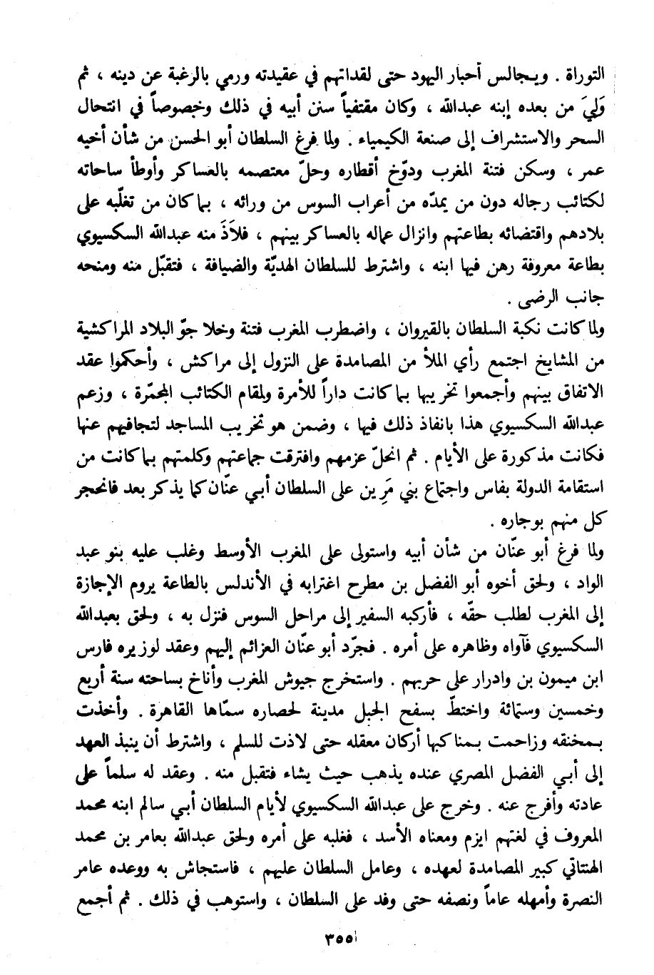 التوراة. ويجالس أحبار اليهود حتى لقد اتهم في عقيدته ورمي بالرغبة عن دينه، ثم ولي من بعده ابنه عبد الله، وكان مقتفيا سنن أبيه في ذلك وخصوصا في انتحال السحر والاستشراف إلى صنعة الكيمياء. ولما فرغ السلطان أبو الحسن من شأن أخيه عمر، وسكن فتنة المغرب ودوّخ أقطاره وحلّ معتصمه بالعساكر وأوطأ ساحاته لكتائب رجاله دون من يمدّه من أعراب السوس من ورائه، بما كان من تغلّبه على بلادهم واقتضائه بطاعتهم وإنزال عماله بالعساكر بينهم، فلاذ منه عبد الله السكسيوي بطاعة معروفة رهن فيها ابنه، واشترط للسلطان الهديّة والضيافة، فتقبّل منه ومنحه جانب الرضى.
