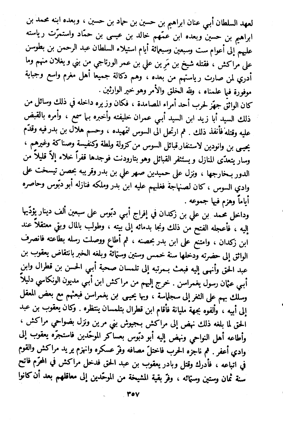 لعهد السلطان أبي عنان إبراهيم بن حسين بن حماد بن حسين، وبعده ابنه محمد بن إبراهيم بن حسين وبعده ابن عمّهم خالد بن عيسى بن حمّاد واستمرّت رياسته عليهم إلى أعوام ست وسبعين وسبعمائة أيام استيلاء السلطان عبد الرحمن بن بطوسن على مراكش، فقتله شيخ بن مرين علي بن عمر الورتاجي من بني ويغلان منهم وما أدري لمن صارت رياستهم من بعده، وهم دكالة جميعا أهل مغرم واسع وجباية موفورة فيما علمناه، وللَّه الخلق والأمر وهو خير الوارثين.