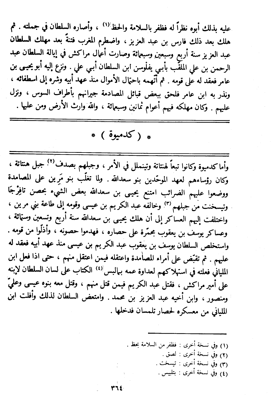 وأما كدميوة وكانوا تبعا لهنتاتة وتين ملّل في الأمر، وجبلهم بصدف [2] جبل هنتاتة، وكان رؤساءهم لعهد الموحّدين بنو سعد الله. ولما تغلّب بنو مرين على المصامدة ووضعوا عليهم الضرائب امتنع يحيى بن سعد الله بعض الشيء بحصن تافرجا وتيسخنت من جبلهم [3] وخالفه عبد الكريم بن عيسى وقومه إلى طاعة بني مرين، واختلفت إليهم العساكر إلى أن هلك يحيى بن سعد الله سنة أربع وتسعين وستمائة، وعساكر يوسف بن يعقوب مجمّرة على حصاره، فهدموا حصونه، وأذلّوا من قومه.