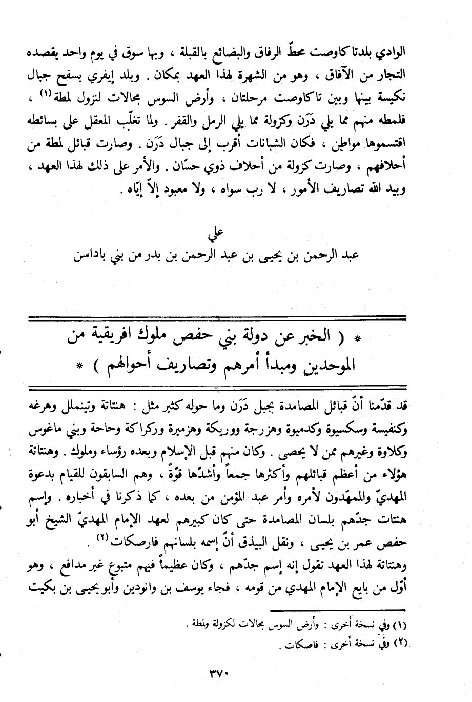 الوادي بلدتا كاوصت محطّ الرفاق والبضائع بالقبلة، وبها سوق في يوم واحد يقصده التجار من الآفاق، وهو من الشهرة لهذا العهد بمكان. وبلد إيفري بسفح جبال نكيسة بينها وبين تاكاوصت مرحلتان، وأرض السوس مجالات لنزول لمطة [1] ، فلمطه منهم مما يلي درن وكزولة مما يلي الرمل والقفر. ولما تغلّب المعقل على بسائطه اقتسموها مواطن، فكان الشبانات أقرب إلى جبال درن. وصارت قبائل لمطة من أحلافهم، وصارت كزولة من أحلاف ذوي حسّان. والأمر على ذلك لهذا العهد، وبيد الله تصاريف الأمور، لا رب سواه، ولا معبود إلّا إيّاه.