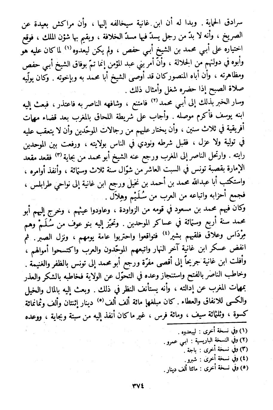 سرادق الحماية. وبدا له أن ابن غانية سيخالفه إليها، وأن مراكش بعيدة عن الصريخ، وأنه لا بدّ من رجل يسدّ فيها مسدّ الخلافة، ويقيم بها شئون الملك، فوقع اختياره على أبي محمد بن الشيخ أبي حفص، ولم يكن ليعدوه [1] لما كان عليه هو وأبوه في دولتهم من الجلالة، وأنّ أمر بني عبد المؤمن إنما تمّ بوفاق الشيخ أبي حفص ومظاهرته، وأن أباه المنصور كان قد أوصى الشيخ أبا محمد به وبإخوته. وكان يولّيه صلاة الصبح إذا حضره شغل وأمثال ذلك.
