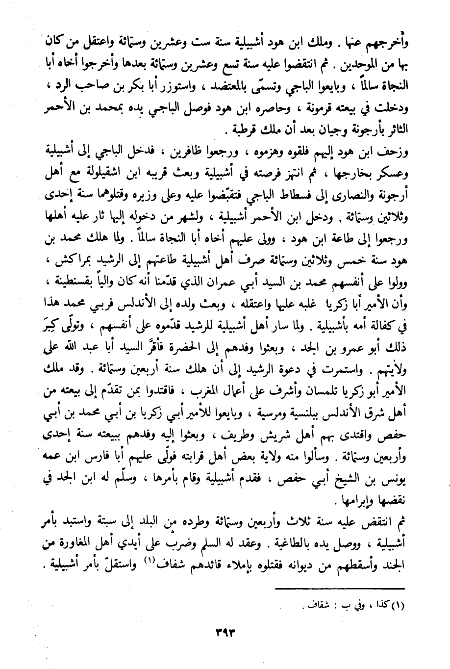 وزحف ابن هود إليهم فلقوه وهزموه، ورجعوا ظافرين، فدخل الباجي إلى إشبيليّة وعسكر بخارجها، ثم انتهز فرصته في إشبيليّة وبعث قريبه ابن اشقيلولة مع أهل أرجونة والنصارى إلى فسطاط الباجي فتقبّضوا عليه وعلى وزيره وقتلوهما سنة إحدى وثلاثين وستمائة. ودخل ابن الأحمر إشبيليّة، ولشهر من دخوله إليها ثار عليه أهلها ورجعوا إلى طاعة ابن هود، وولى عليهم أخاه أبا النجاة سالما. ولما هلك محمد بن هود سنة خمس وثلاثين وستمائة صرف أهل إشبيليّة طاعتهم إلى الرشيد بمراكش، وولوا على أنفسهم محمد بن السيد أبي عمران الّذي قدّمنا أنه كان واليا بقسنطينة، وأن الأمير أبا زكريا غلبه عليها واعتقله، وبعث ولده إلى الأندلس فربي محمد هذا في كفالة أمه بأشبيليّة. ولما سار أهل إشبيليّة للرشيد قدّموه على أنفسهم، وتولّى كبر ذلك أبو عمرو بن الجد، وبعثوا وفدهم إلى الحضرة فأقرّ السيد أبا عبد الله على ولايتهم. واستمرت في دعوة الرشيد إلى أن هلك سنة أربعين وستمائة. وقد ملك الأمير أبو زكريا تلمسان وأشرف على أعمال المغرب، فاقتدوا بمن تقدّم إلى بيعته من أهل شرق الأندلس ببلنسية ومرسية، وبايعوا للأمير أبي زكريا بن أبي محمد بن أبي حفص واقتدى بهم أهل شريش وطريف، وبعثوا إليه وفدهم ببيعته سنة إحدى وأربعين وستمائة. وسألوا منه ولاية بعض أهل قرابته فولّى عليهم أبا فارس ابن عمه يونس بن الشيخ أبي حفص، فقدم إشبيليّة وقام بأمرها، وسلّم له ابن الجد في نقضها وإبرامها.