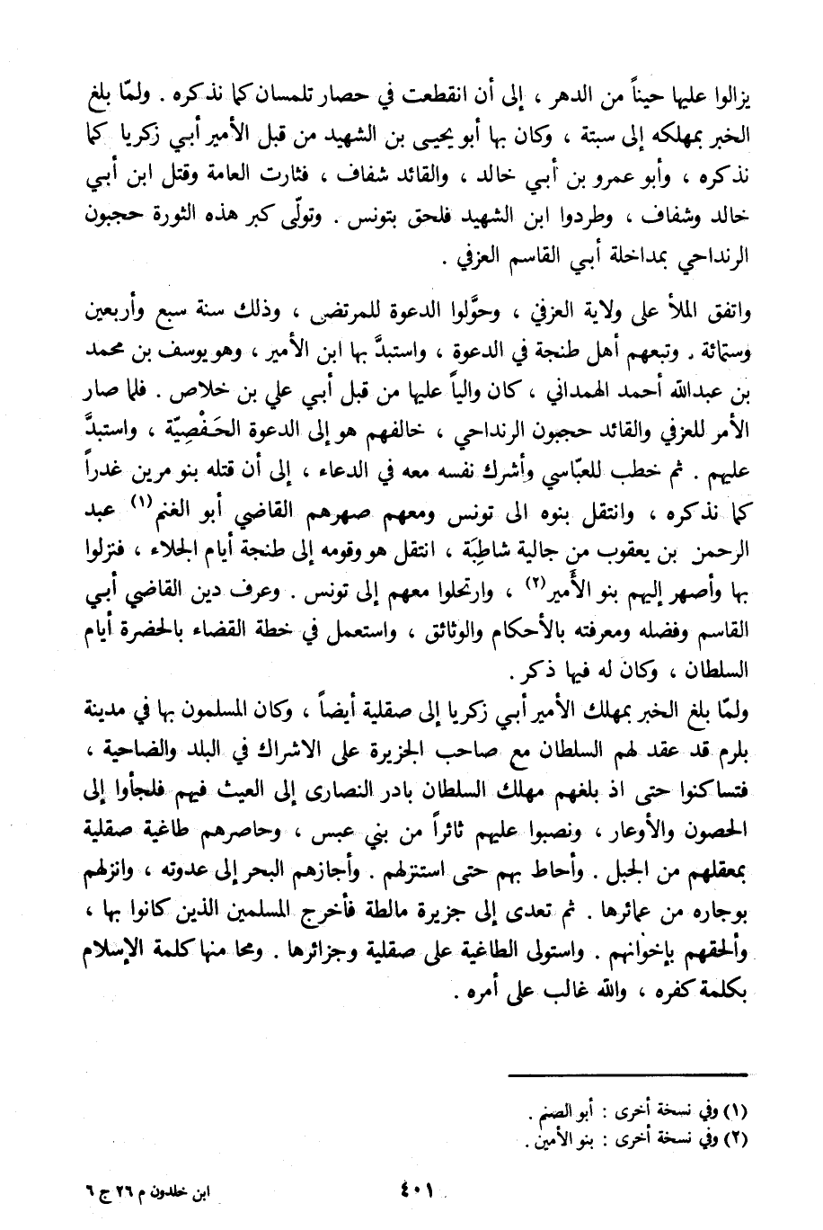 واتفق الملأ على ولاية العزفي، وحوّلوا الدعوة للمرتضى، وذلك سنة سبع وأربعين وستمائة. وتبعهم أهل طنجة في الدعوة، واستبدّ بها ابن الأمير، وهو يوسف بن محمد بن عبد الله أحمد الهمدانيّ، كان واليا عليها من قبل أبي علي بن خلاص. فلما صار الأمر للعزفي والقائد حجبون الرنداحي، خالفهم هو إلى الدعوة الحفصيّة، واستبدّ عليهم. ثم خطب للعبّاسي وأشرك نفسه معه في الدعاء، إلى أن قتله بنو مرين غدرا كما نذكره، وانتقل بنوه الى تونس ومعهم صهرهم القاضي أبو الغنم [1] عبد الرحمن بن يعقوب من جالية شاطبة، انتقل هو وقومه إلى طنجة أيام الجلاء، فنزلوا بها وأصهر إليهم بنو الأمير [2] ، وارتحلوا معهم إلى تونس. وعرف دين القاضي أبي القاسم وفضله ومعرفته بالأحكام والوثائق، واستعمل في حطة القضاء بالحضرة أيام السلطان، وكان له فيها ذكر.