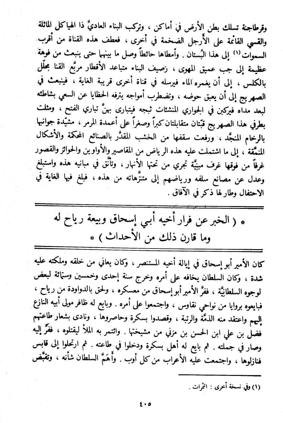 وقرطاجنة تسلك بطن الأرض في أماكن، وتركب البناء العاديّ ذا الهياكل الماثلة والقسي القائمة على الأرجل الضخمة في أخرى، فعطف هذه القناة من أقرب السموات [1] إلى هذا البستان. وأمطاها حائطا وصل ما بينهما حتى ينبعث من فوهة عظيمة إلى جب عميق المهوى، رصيف البناء متباعد الأقطار مربّع القنا مجلّل بالكلس، إلى أن يغمره الماء فيرسله في قناة أخرى قريبة الغاية، فينبعث في الصهريج إلى أن يعبق حوضه، وتضطرب أمواجه يترفه الحظايا عن السعي بشاطئه لبعد مداه فيركبن في الجواري المنشئات ثبجه فيتبارى بهنّ تباري الفتح، ومثلت بطرفي هذا الصهريج قبّتان متقابلتان كبرا وصغرا على أعمدة المرمر، مشيّدة جوانبها بالرخام المنجّد، ورفعت سقفها من الخشب المقدّر بالصنائع المحكمة والأشكال المنمّقة، إلى ما اشتملت عليه هذه الرياض من المقاصير والأواوين والحوائز والقصور غرفا من فوقها غرف مبنيّة تجري من تحتها الأنهار، وتأنّق في مبانيه هذه واستبلغ وعدل عن مصانع سلفه ورياضهم إلى متنزّهاته من هذه، فبلغ فيها الغاية في الاحتفال وطار لها ذكر في الآفاق.